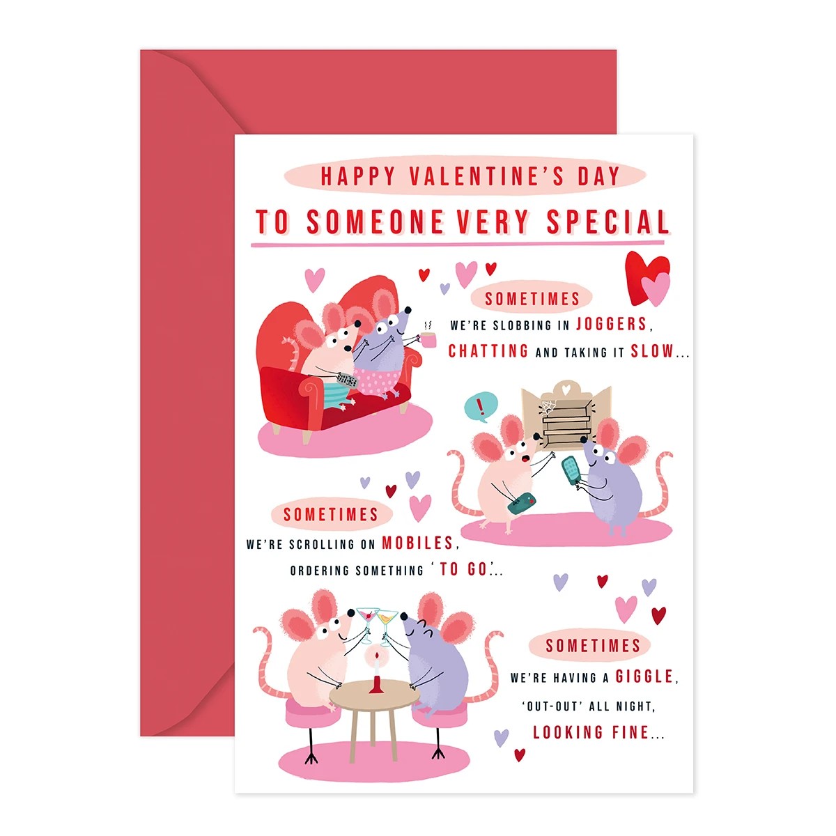 The front of the card features red foil highlights, adorable illustrations of a mouse couple sitting on a couch, ordering takeout, and having a night out surrounded by love hearts, and the message ''HAPPY VALENTINE'S DAY TO SOMEONE VERY SPECIAL. SOMETIMES WE'RE SLOBBING IN JOGGER, CHATTING AND TAKING IT SLOW... SOMETIMES WE'RE SCROLLING ON MOBILES ORDERING SOMETHING 'TO GO'... SOMETIMES WE'RE HAVING A GIGGLE, 'OUT-OUT' ALL NIGHT, LOOKING FINE...'