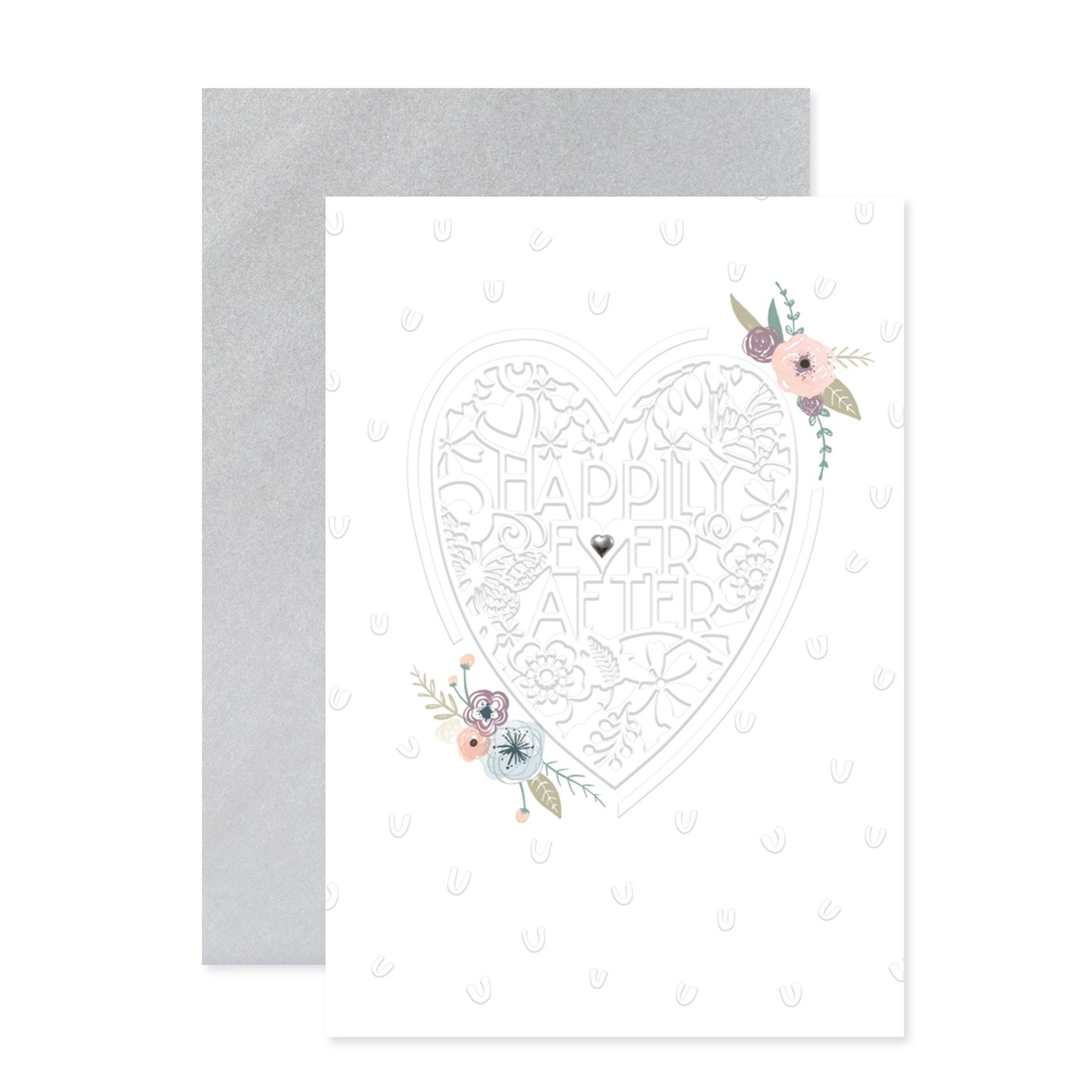 The front of the card features a silver foil heart attachment and white embossed heart with the message 'HAPPILY EVER AFTER'
