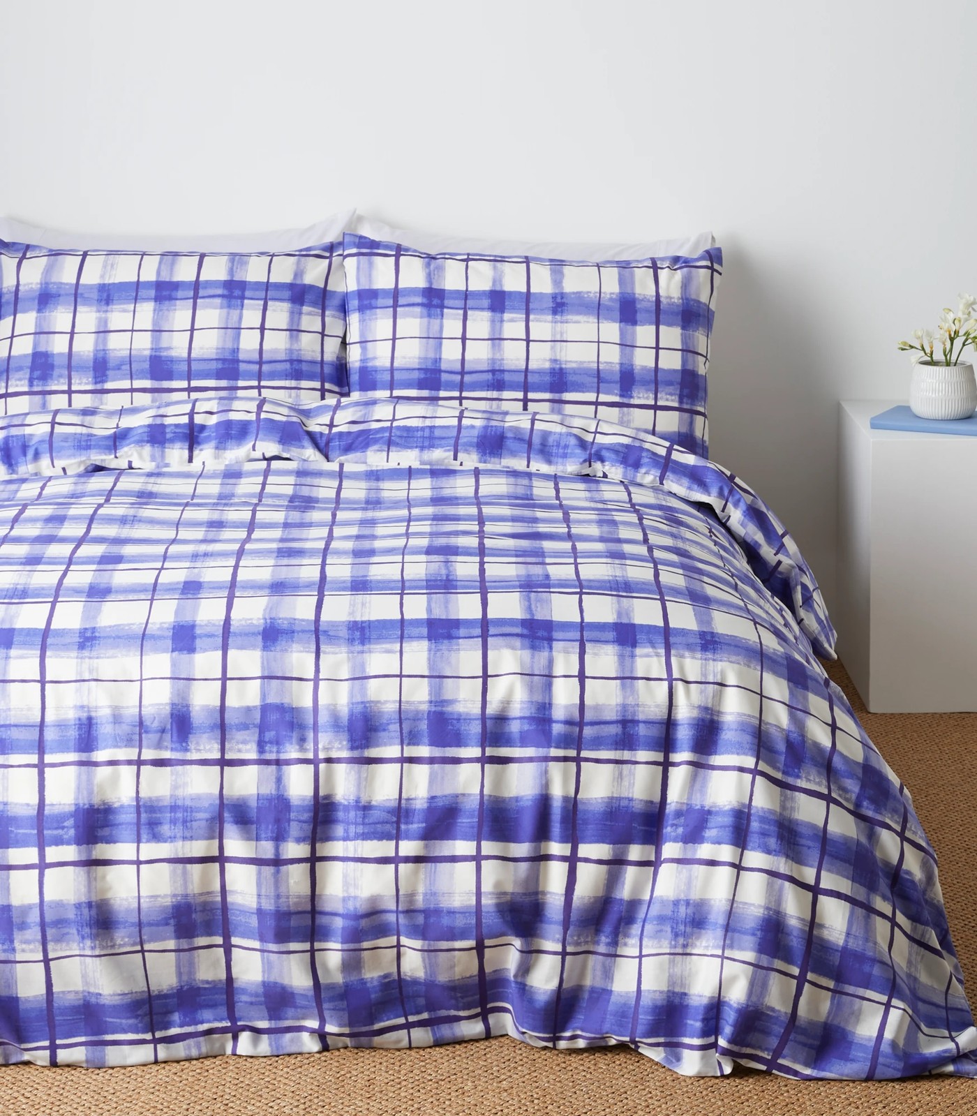 Revamp your bedroom decor with our Modern Blue Brushstroke Quilt Cover Set. Made from a soft and breathable cotton/polyester blend, this set offers comfort and durability for a restful night's sleep. The striking brushstroke grid print in blue adds a contemporary touch to your bedding, elevating the aesthetics of your bedroom. Easy to care for, it's machine washable, ensuring convenience and practicality. Redefine your sleep space with this stylish quilt cover set and enjoy a harmonious blend of comfort and modern design.