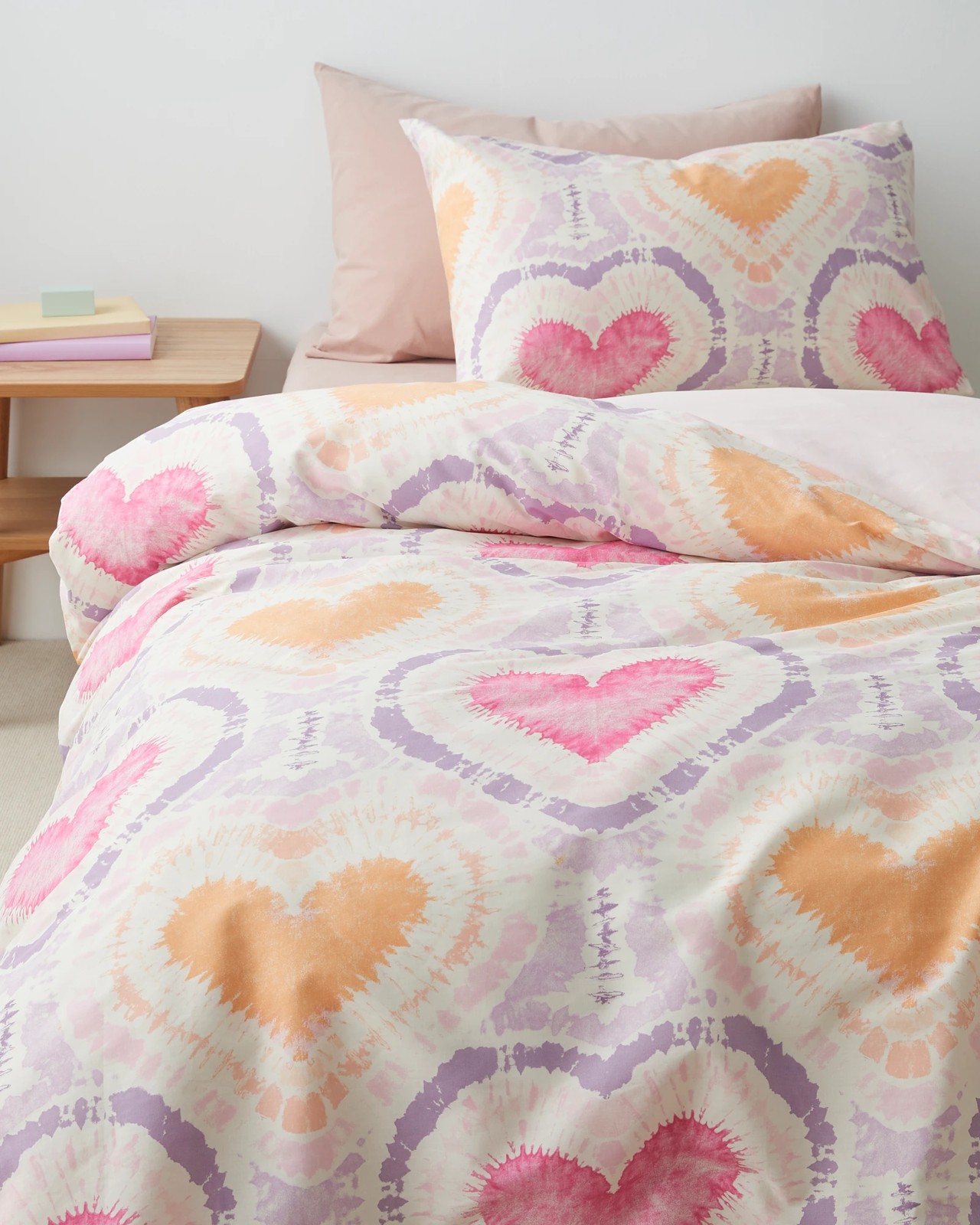 Bring a splash of colour to your bedroom with our Heart Tie Dye Quilt Cover Set. Made from a cosy cotton/polyester mix, this reversible set features a heart tie dye design on one side and a soft pink on the other. Finished with a neat knife edge, it combines style and comfort perfectly. It’s also easy to care for, with simple machine wash instructions. Brighten up your bedroom and enjoy a comfortable night's sleep with this charming quilt cover set.