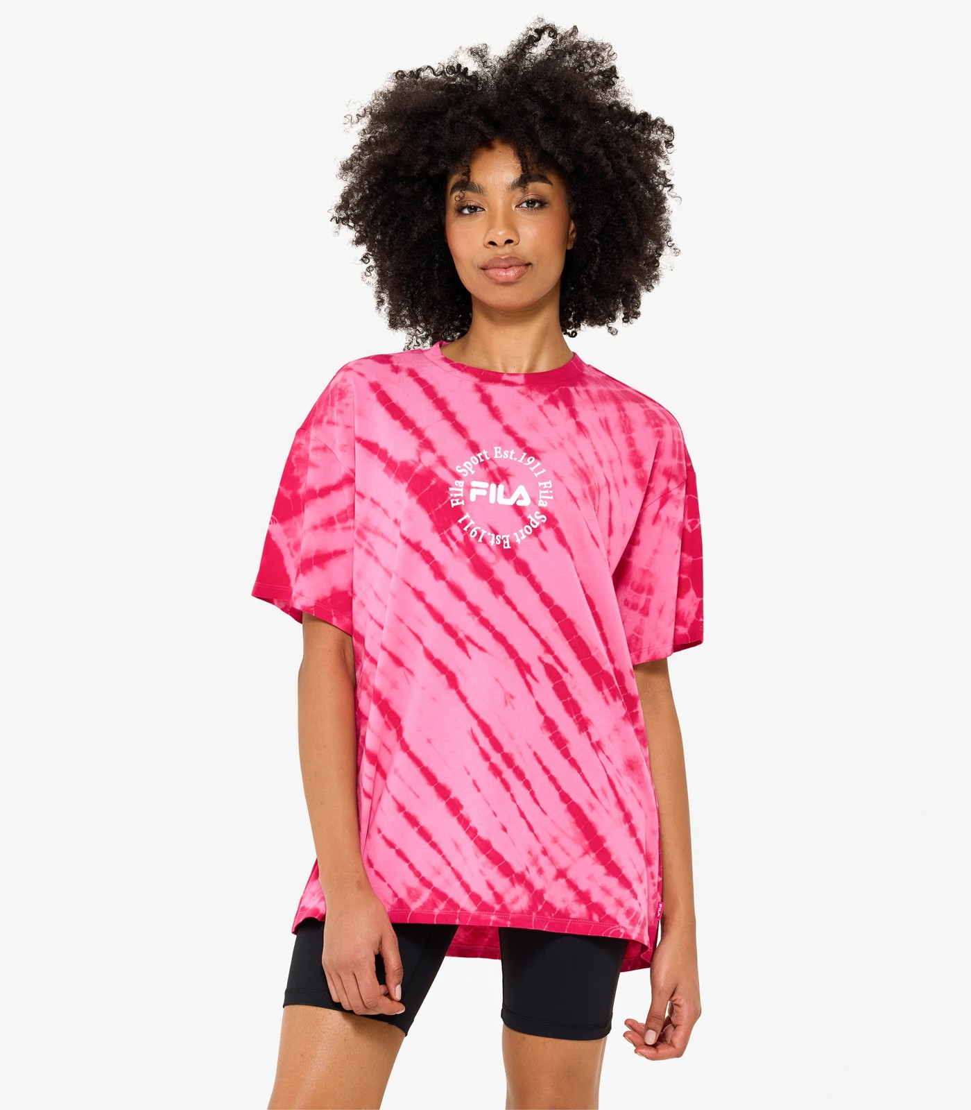 Elevate your style and make a statement when you step out in our Fila women's Heidi tie-dye t-shirt. This oversized boyfriend tee is crafted from a soft cotton Jersey fabric and features a true tie-dye all over. Featuring extended shoulders, a ribbed neckline and a Fila circular print to the centre front chest. Indulge in the ultimate blend of style, comfort, and quality! Complete your look by pairing back with our Lucinda bike shorts (sold seperately).