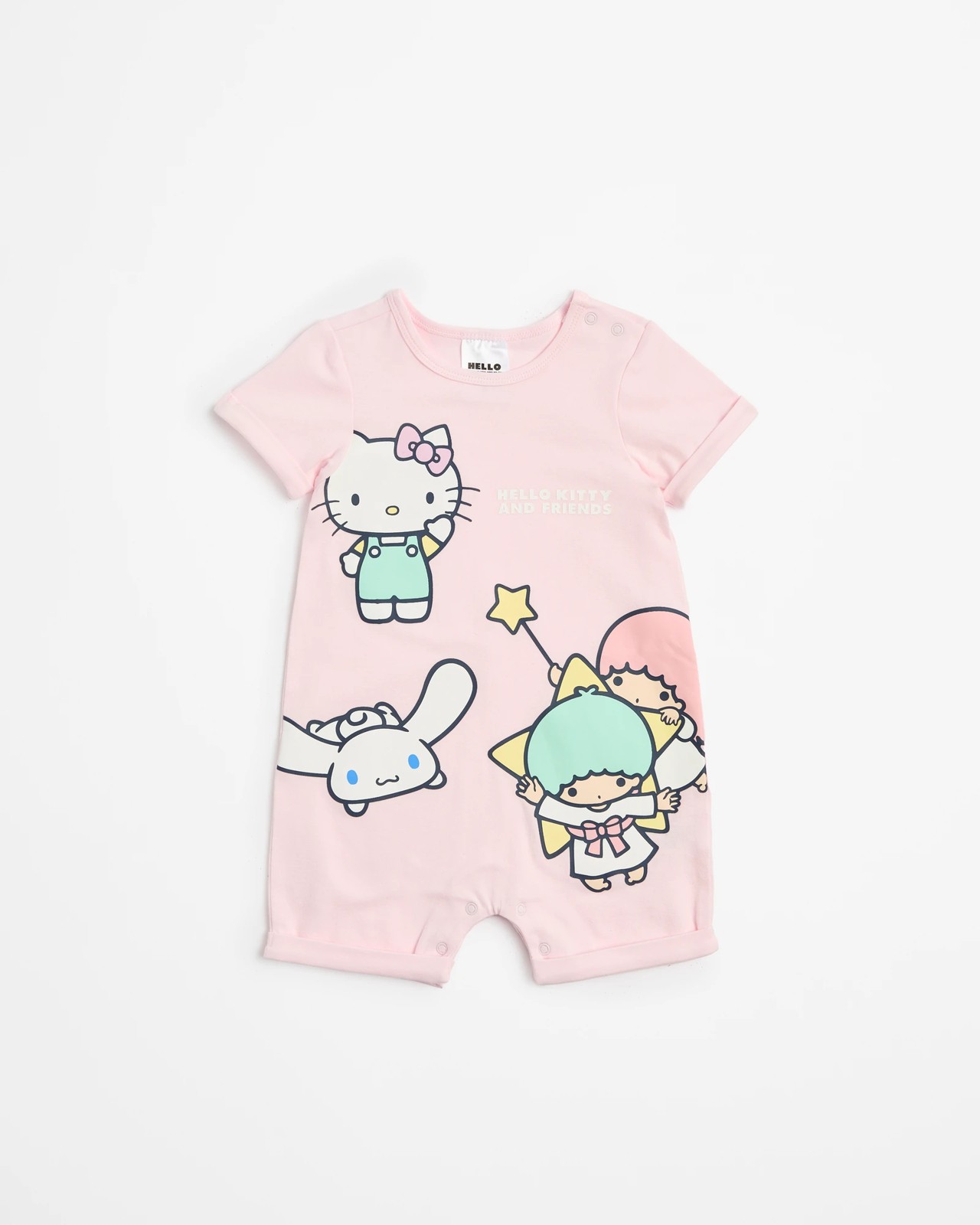 Dress your little one in this adorable Hello Kitty baby romper. Made from soft, stretchy cotton, this cosy romper ensures comfort and flexibility for active infants. The playful Hello Kitty print on the front adds a touch of fun, while the convenient press studs at the shoulder and crotch make changing a breeze. Its regular fit and cuffed trim keep your baby looking smart and stylish all day. The pink colour and short sleeves are perfect for warmer weather. Make your tiny tot's wardrobe more delightful with this charming romper today.