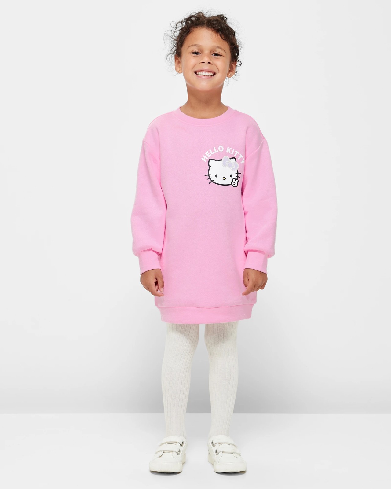 Introducing the charming Hello Kitty Fleece Jumper Dress, perfect for your little one. Made from a soft cotton-rich blend, this delightful pink jumper dress features a cosy ribbed crew neck and long sleeves with ribbed cuffs for extra warmth. The adorable Hello Kitty print on the front and the large Hello Kitty design on the back add a playful touch that she'll love. Fleece-lined for comfort, it's ideal for cooler days. Watch her light up with joy as she steps out in this stylish and snug outfit. Don't miss out – grab this enchanting Hello Kitty dress today!