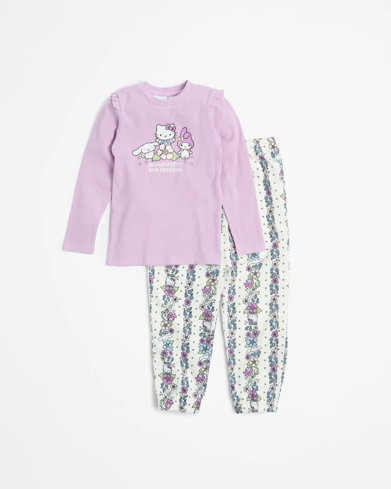 Introducing our charming Hello Kitty Girls Long Sleeve Rib Flannelette Pyjama Set, perfect for cosy nights and sweet dreams. Made from soft, stretchy cotton, this set ensures a snug, regular fit that’s both comfortable and stylish. The two-piece set features a ribbed crew neck top with delightful shoulder ruffle details and a playful Hello Kitty and Friends print, making bedtime fun and exciting. The matching flannelette pants with an elastic waistband and cuffs provide extra warmth and ease of movement. Treat your little one to this adorable set and watch her light up with joy – an ideal addition to her night-time routine.