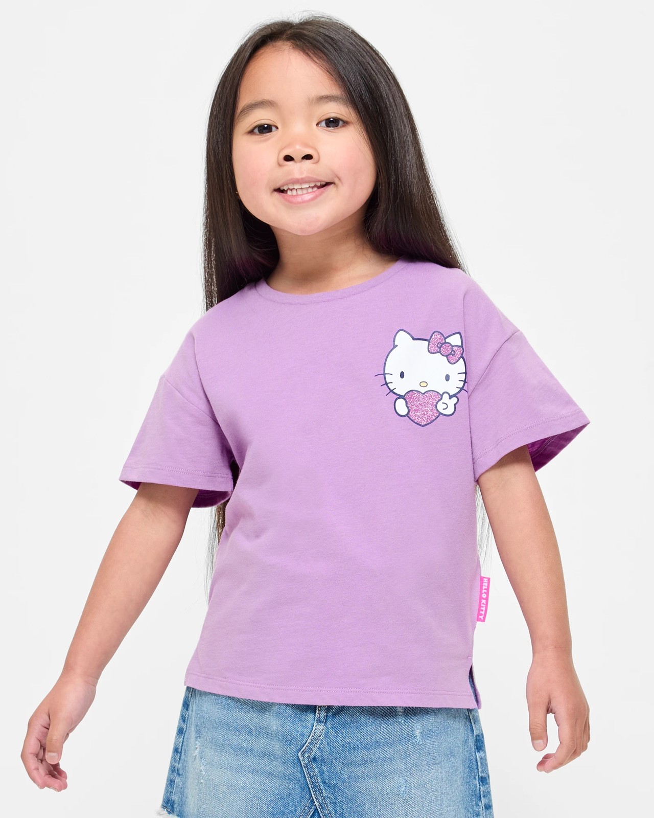 Step into a world of charm with our adorable Hello Kitty T-shirt. This delightful garment, featuring a playful glitter print on the front and a large Hello Kitty graphic on the back, adds a touch of fun to any outfit. Made from soft, breathable cotton with a comfortable regular fit, it's perfect for all-day wear. The pretty purple hue and classic crew neck style make it a versatile addition to any wardrobe. Embrace the cuteness and make this must-have T-shirt yours today!