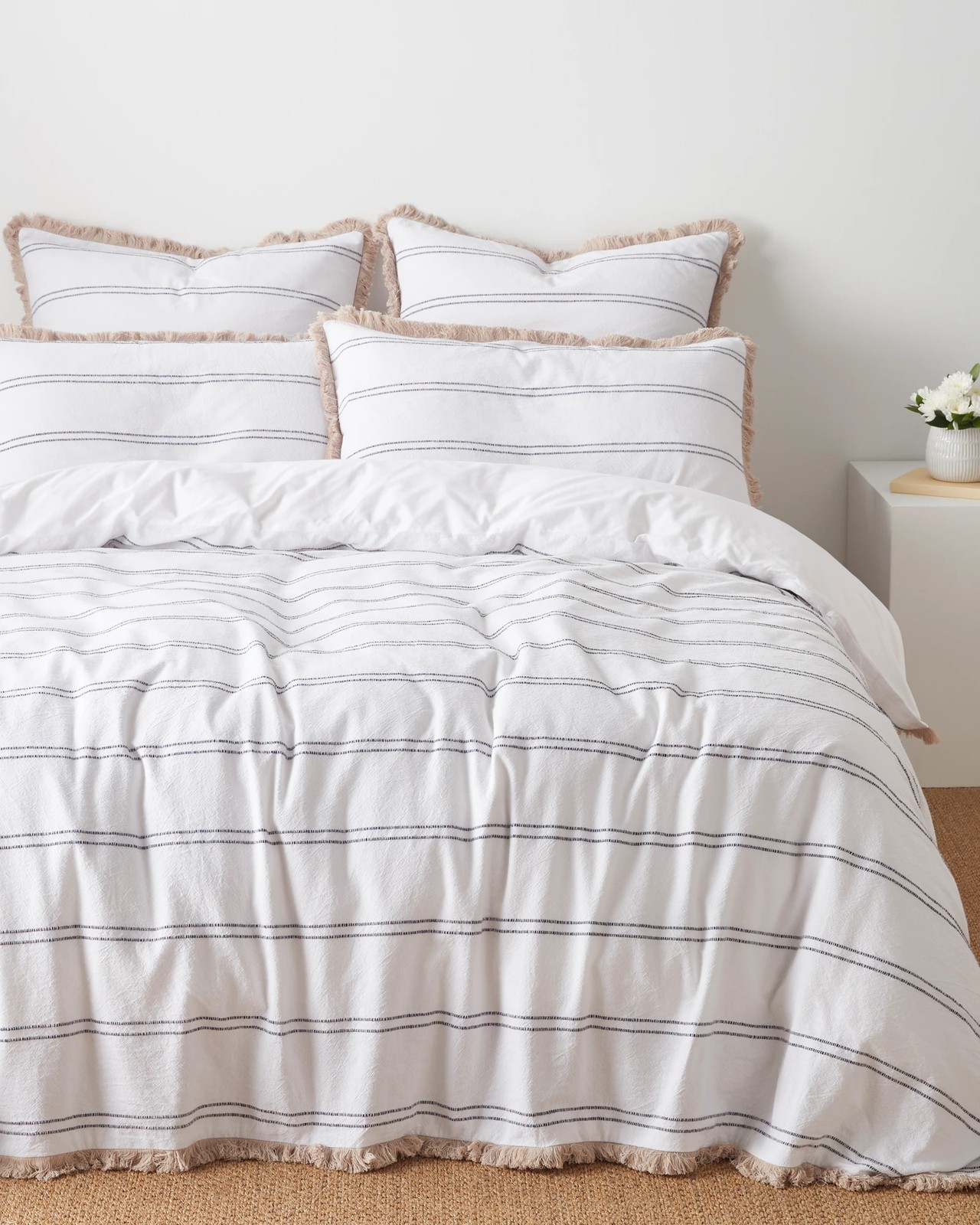 Enhance your bedroom with the Hendrix Textured Stripe Quilt Cover Set. Made from soft cotton, this set features a stylish black and white stripe pattern, complemented by fringed edge detailing. Enjoy the cosy and inviting atmosphere it creates. Don't forget to pair it with the matching Hendrix textured stripe European pillowcase, which is available separately. Make over your space and enjoy the comfort it brings.