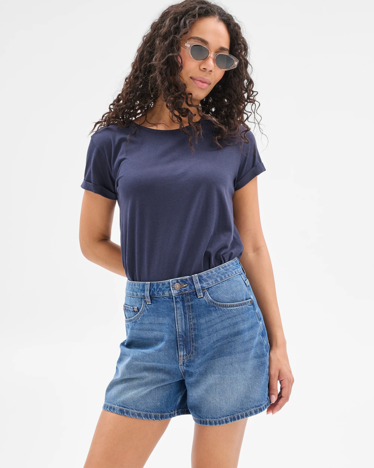 Step into style and comfort with these high rise A-line denim shorts, designed from a cotton and lyocell blend for a wonderfully soft touch. The classic five pocket style offers extra convenience, and the regular fit makes these shorts easy to wear wherever your day takes you. With a simple zip and button closure and a straight hem, you’ll love slipping these on for picnics or leisurely afternoons. Bring a cheerful vibe to every outing.