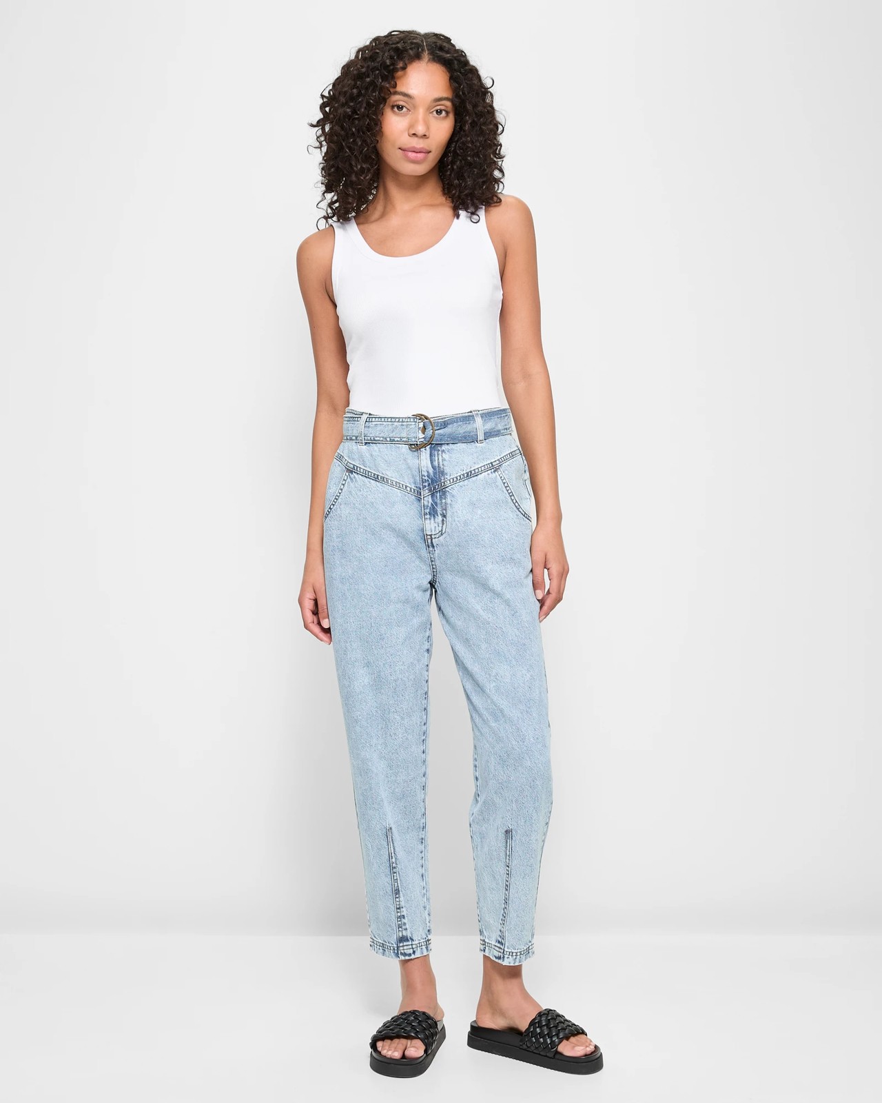 Welcome to your new favourite jeans! Step into comfort and style with our High Rise Ankle Length Yoke Front Tapered Leg Denim Jeans. Crafted from a blend of cotton and lyocell, these jeans are not only fashionable but also feature recycled materials. Enjoy the regular fit and island blue hue that will make you stand out effortlessly. The structured waistband with belt loops, front button and zip fly closure, and unique removable front closure belt add a trendy flair to your look. With thoughtful details like yoke front panelling and practical pockets, these ankle-length jeans are a must-have for your wardrobe. Elevate your fashion game today!