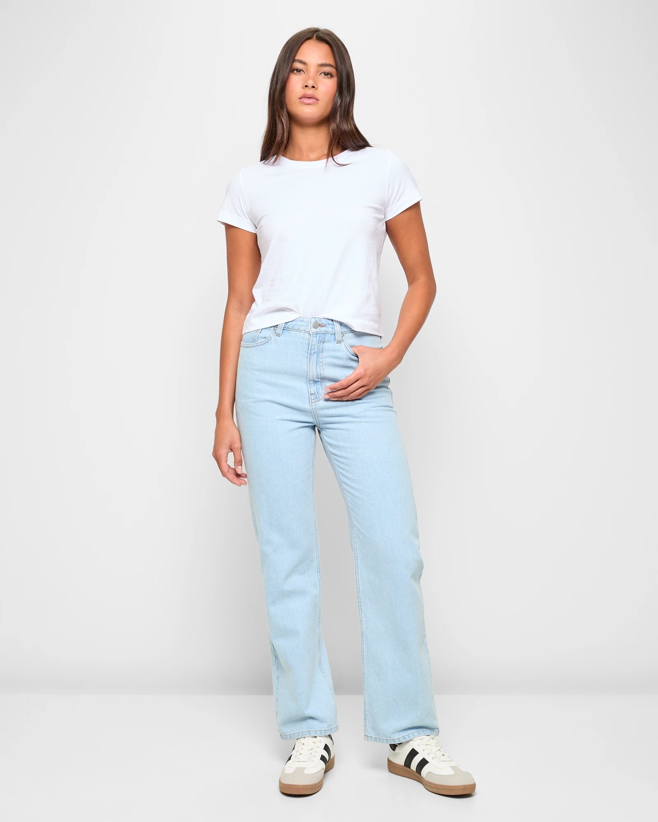 Experience timeless style with the High Rise Straight Leg Denim Jeans by Lily Loves. These jeans, made from a soft cotton blend, boast a light blue wash and a regular fit for everyday wear. The high-rise waist ensures a secure and supportive feel, while the straight leg cut adds a classic touch to your look. Featuring a structured waistband with belt loops, and a classic 5-pocket design, these jeans are both functional and fashionable. The front button and zip fly closure provide added convenience. Perfect for any casual outfit, make these your new go-to pair.