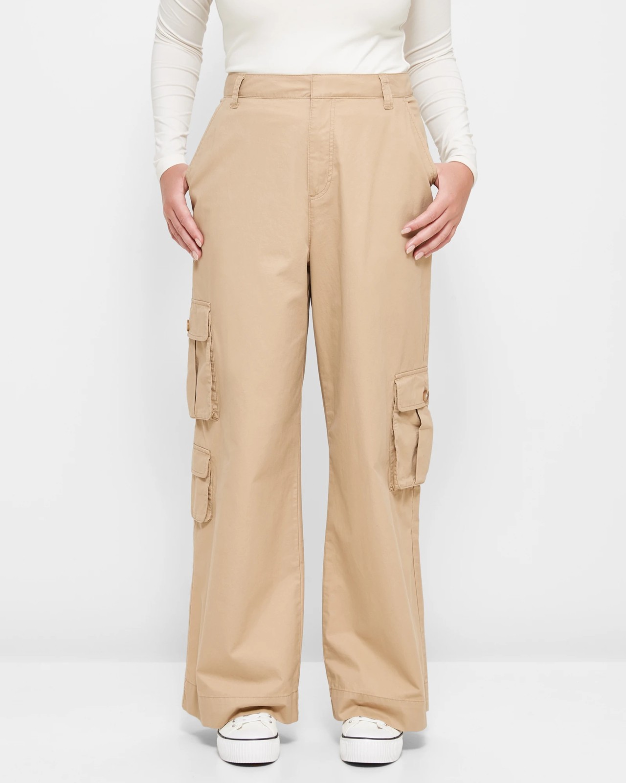 Introducing the High Rise Wide Leg Cargo Pants by Lily Loves. Crafted from a lightweight cotton fabric, these pants offer a comfortable and regular fit. The classic cargo design features a structured waistband with belt loops and a front clasp and fly zip closure for easy wear. With side pockets and fold-over cargo pockets on the side thigh with button closures, you'll have plenty of space to store your essentials. There's even an additional small side thigh pocket with a fold-over top. The wide leg and full length give these pants a trendy touch, while the straight hemline adds a polished finish. Complete the look with a tucked-in top and your favourite accessories. Upgrade your wardrobe with these must-have cargo pants that combine style and functionality.