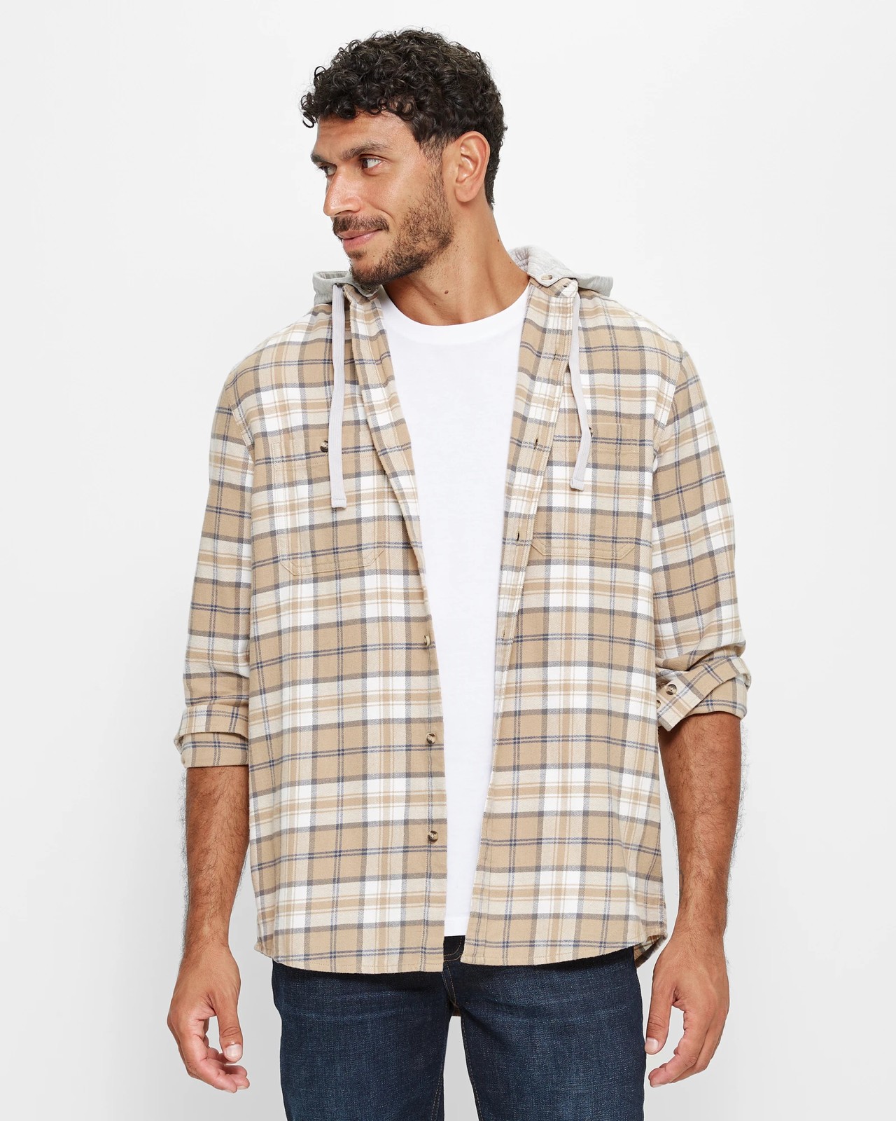 Upgrade your casual style with our Mens Hooded Shirt. Made from a soft and breathable cotton/polyester blend, this shirt provides ultimate comfort. The double brushed fabric adds an extra level of softness and warmth. The regular fit offers a relaxed and comfortable feel for everyday wear. Featuring a stylish check print, this shirt combines trendy and classic elements. The collared neckline with a hood and drawstrings adds a unique touch. Elevate your wardrobe with this check print hooded shirt.