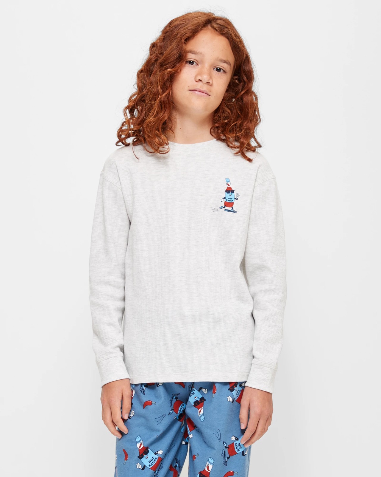 Upgrade your little one's bedtime wardrobe with this Hot Sauce Cotton Pyjama Set. Made from a soft and comfortable cotton blend, this 2 piece set features a stylish grey/blue design. The ribbed crew neck and long sleeves with ribbed cuffs provide a snug fit, while the small Hot Sauce print adds a touch of fun. The straight hem and matching all over print flannelette pants with an elastic waistband complete the look. Perfect for a cosy night's sleep or lounging around the house, this pyjama set is a must-have for any young adventurer. Treat your child to ultimate comfort and style today!