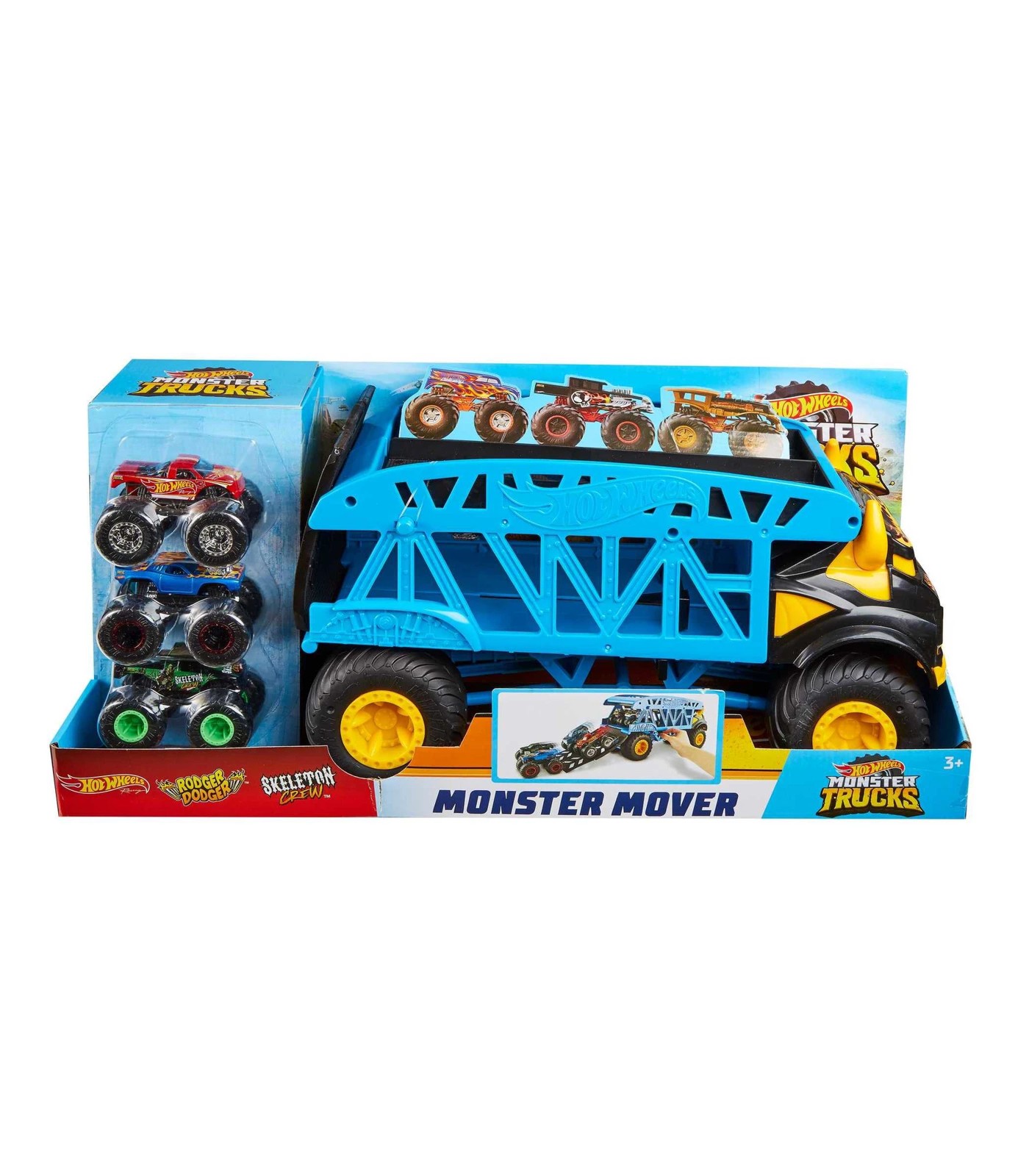 Transport Hot Wheels Monster Trucks with this large-scale Monster Mover that stores up to 12 trucks kids can launch into action from the rear ramp with the flip of a switch! Signature GIANT tires for rolling over obstacles! Transport, store and organise kids' collection of 1:64 scale monster trucks. This truck organiser is designed like Steer Clear, one of Hot Wheels most iconic trucks! The bundle includes three cool Monster Trucks; Skeleton Crew, Rodger Dodger and the Hot Wheels Racing monster truck for smashing and crashing fun right out of the box.