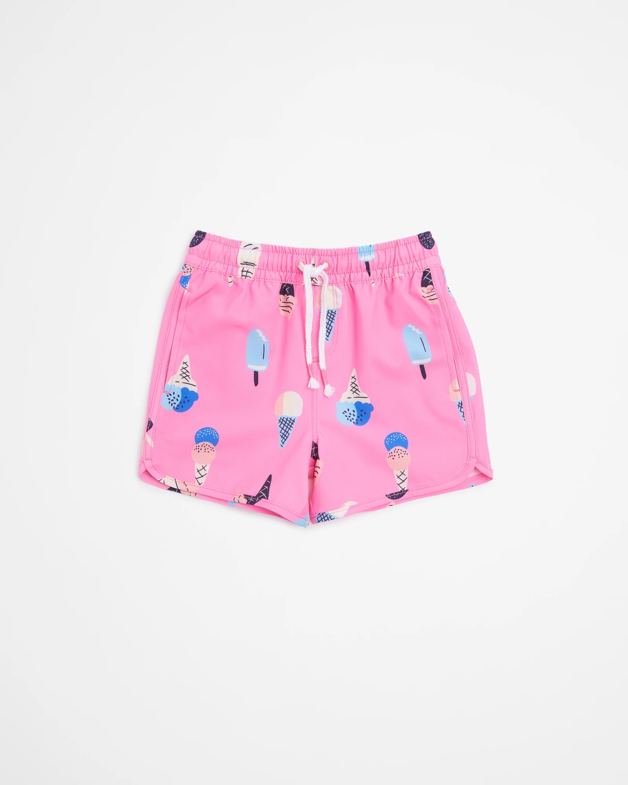 These Ice Cream Swim Boardshorts are the perfect addition to any summer wardrobe! Crafted from recycled materials, these boardshorts have a regular slip on fit with an elastic waistband and drawcord for adjustable comfort. The hot pink all-over ice cream print creates an eye-catching look, perfect for days at the beach or pool. With side seam pockets and a mermaid hemline, these boardshorts are a stylish way to stay cool in the summer heat!