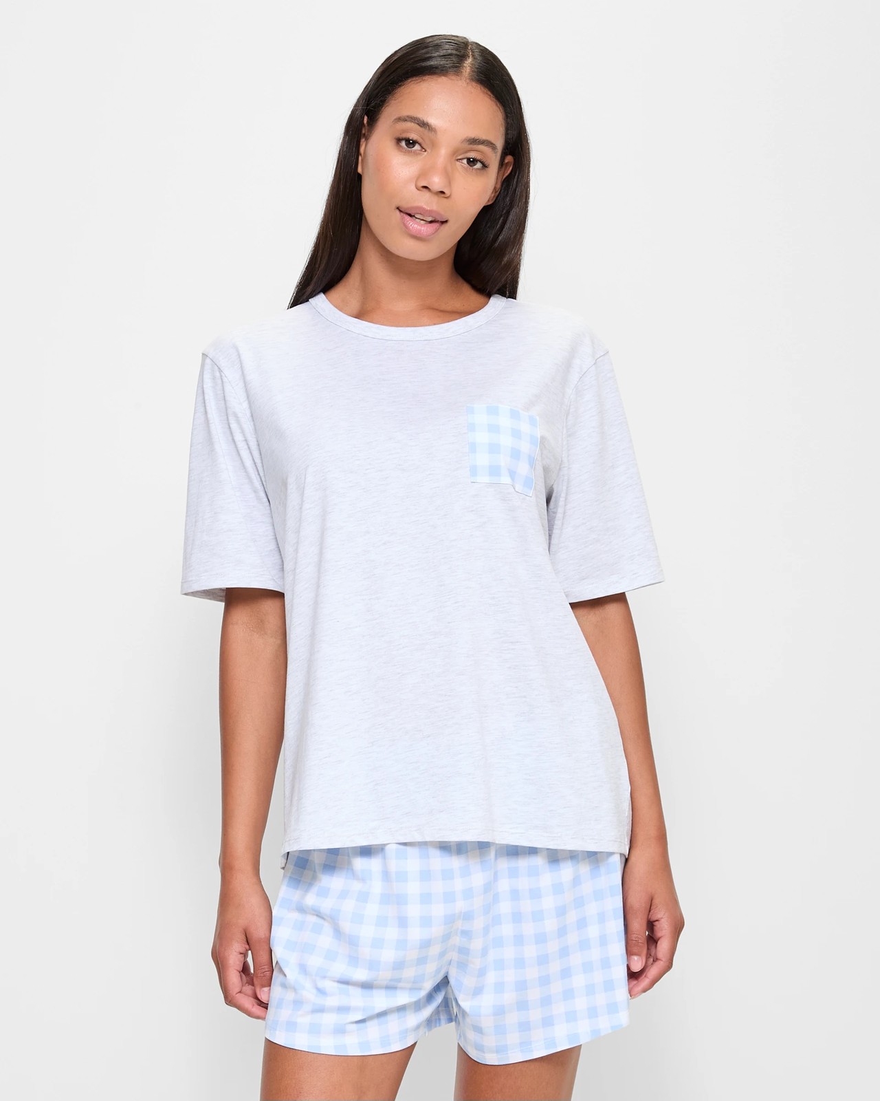 Top: grey marle, ribbed crew neckline, short sleeves, open chest gingham pocket, straight hemline