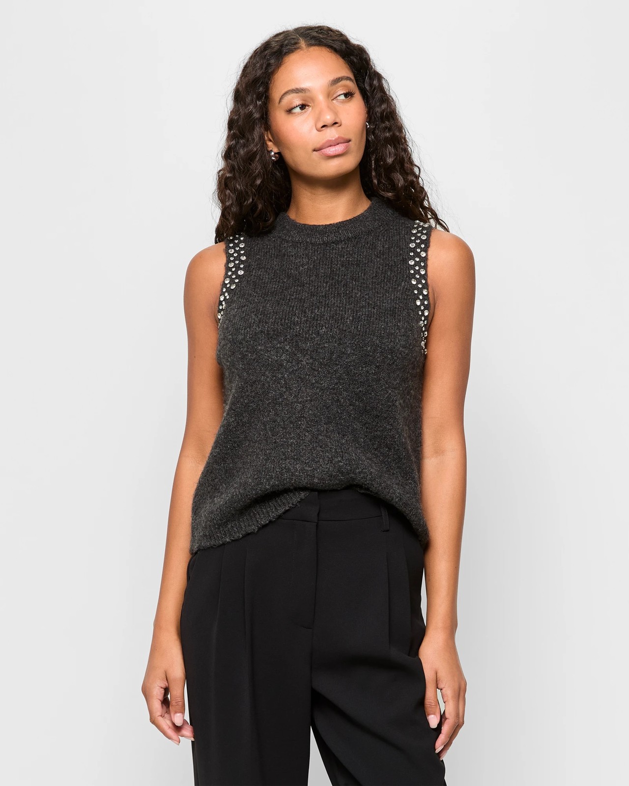Enhance your wardrobe with this Jewel Detail Sleeveless Knit Vest, designed to offer both comfort and style on cooler days. Its blend of soft fibres provides a cosy feel, while the stretch elastane ensures you move with ease throughout your day. The intricate knit pattern and sparkling jewel accents around the arms offer a gentle hint of sophistication, making this vest an excellent choice for both casual and dressed-up occasions. The charcoal marle shade complements a variety of outfits, with ribbed details at the neckline and hem giving a neat finish. Make this versatile piece your favourite for layering or wearing solo, and step out with added confidence.