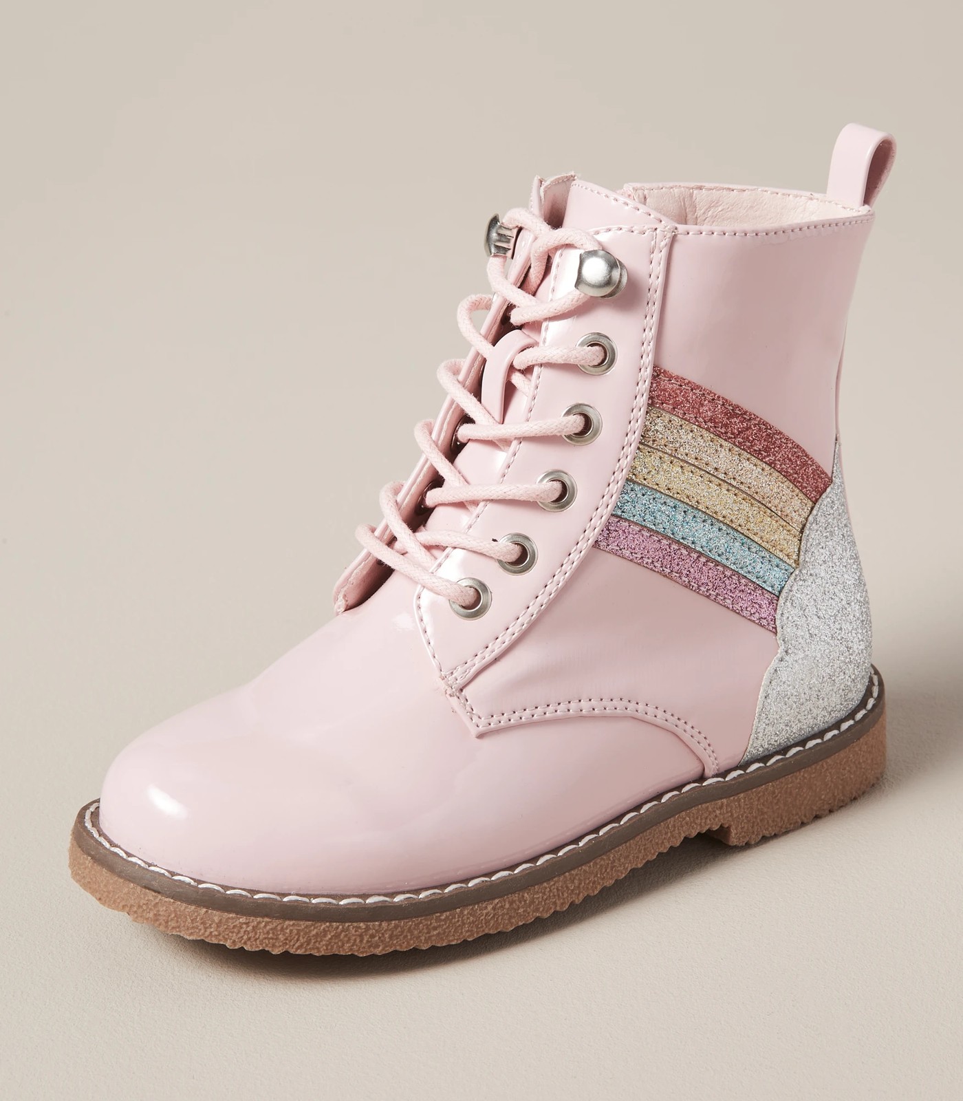 A great coverup shoe for the wintery months, the junior patent lace up boots has a great glittery rainbow detail on the outer, has a shiny patent leather outer and a lace up front.