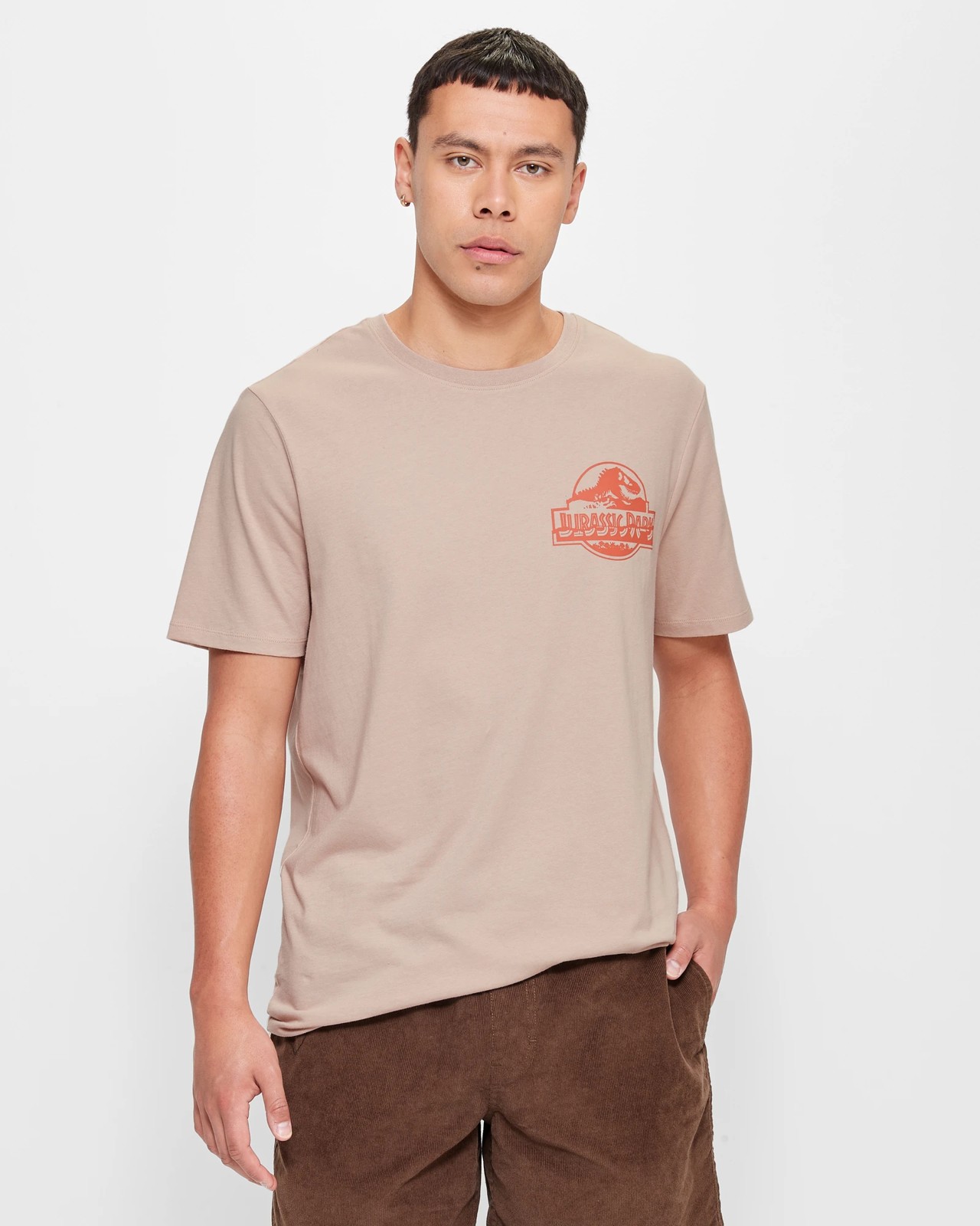 Head back to prehistoric times with our Jurassic Park Print T-Shirt. Crafted with a soft cotton/polyester blend, this shirt comes in a regular fit and Mushroom colour. It features a Jurassic Park chest and large back print, along with a crew neckline and short sleeves. The straight hem completes the classic look of this unique T-shirt. So, get ready for your next adventure in style!