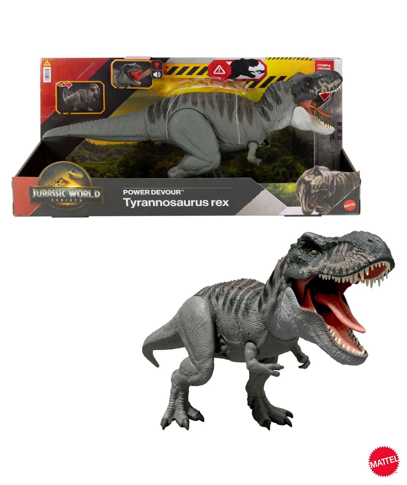 This Power Devour Tyrannosaurus rex inspired by Jurassic World Rebirth has a ferocious repeating chomp feature! When the tongue is pressed down, there's an initial victory roar. When the tongue is held down longer, it activates a fierce continuous frenzy of chomping action with lights and sounds! This feature can provide action-filled battle play as the T. rex chomps on other dinosaur figures! Manipulating the tail moves the head up and down or side to side with the huge jaw opened wide! Scan the Tracking Code on the dinosaur's foot in the free Jurassic World Play App with a compatible smart device (Android or iOS, not included) to unlock a digital version of the dinosaur and play the fiercely fun game to race various vehicles on land, air and sea. Makes a great gift for dinosaur fans ages 4 years and up. Colours and decorations may vary.