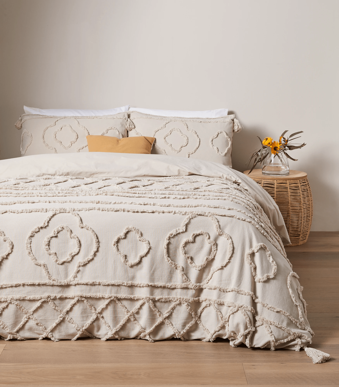 Crafted from soft stonewashed cotton, the Karah Geo Tufted Quilt Cover Set comes in a neutral colour to complement any interior. The set features a geometric tufted design and includes a quilt cover and two pillowcases. Style with the matching European pillowcase (sold separately) to complete the look.