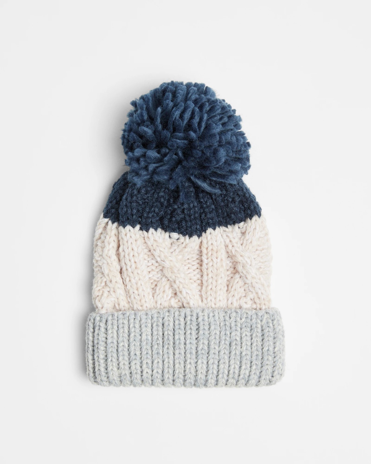 Introducing our Kids Colour Block Cable Knit Beanie - a stylish winter essential for your little ones. Crafted from a cosy acrylic fabric, this beanie boasts an attractive cable knit design and classic styling with a turn-over ribbed cuff hem and a large pom pom on top. It's not just for fashion, it's designed to keep your little one's head warm during chilly days. Give them the gift of warmth and style this season by adding this beanie to their wardrobe!