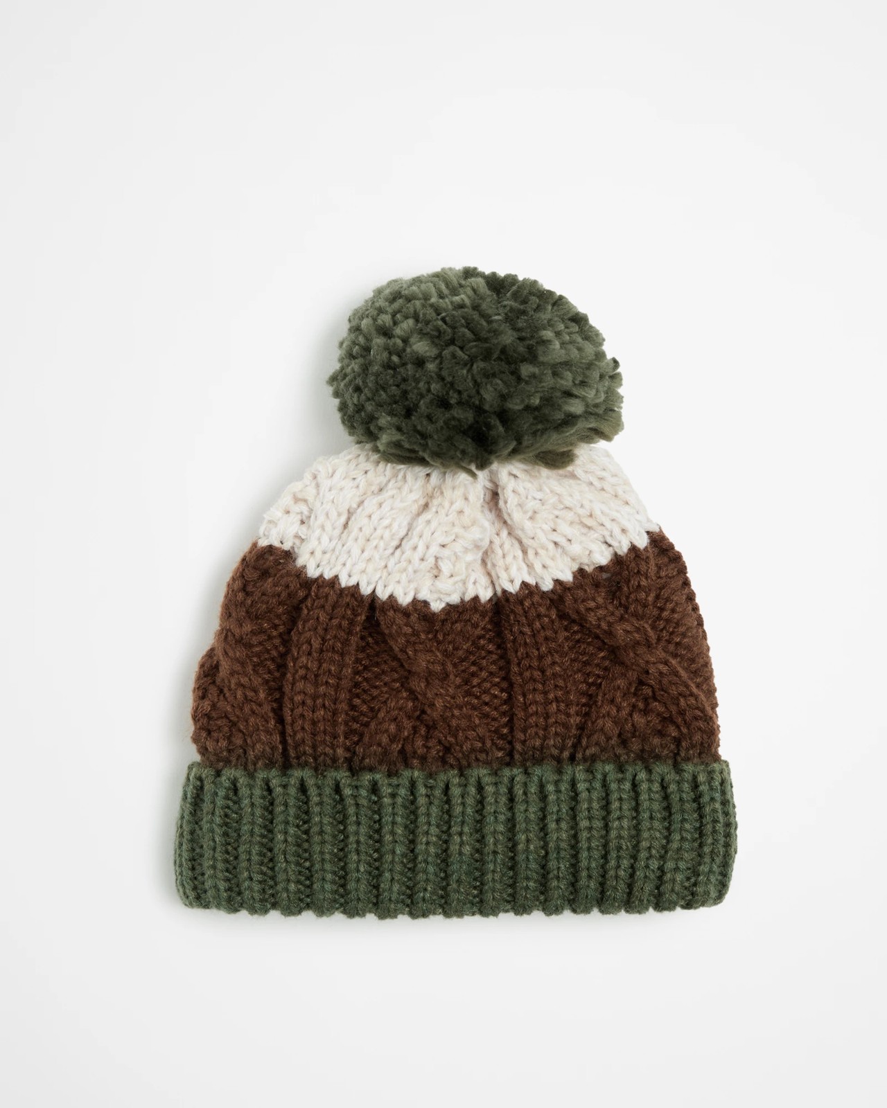 Introducing our Kids Colour Block Cable Knit Beanie - a stylish winter essential for your little ones. Crafted from a cosy acrylic fabric, this beanie boasts an attractive cable knit design and classic styling with a turn-over ribbed cuff hem and a large pom pom on top. It's not just for fashion, it's designed to keep your little one's head warm during chilly days. Give them the gift of warmth and style this season by adding this beanie to their wardrobe!