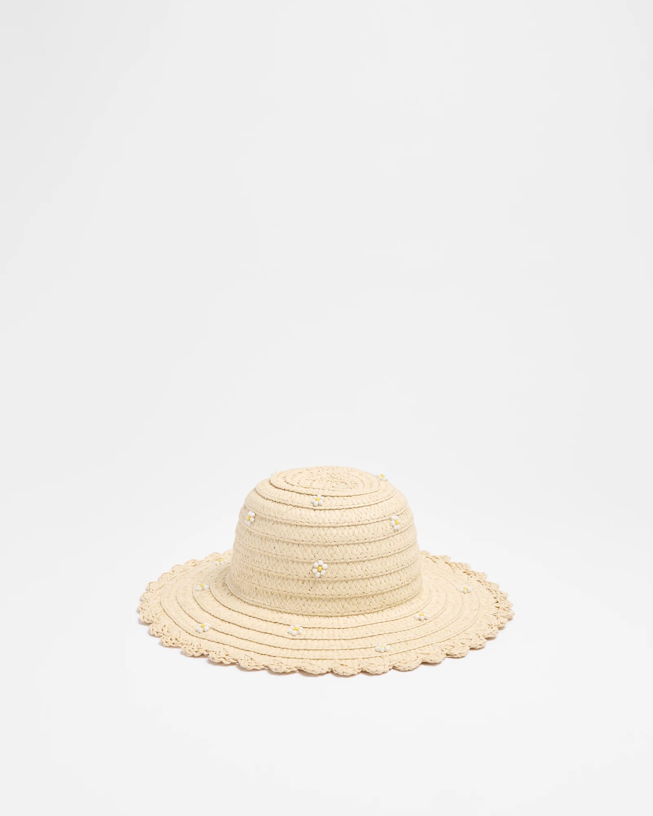 Your child will adore this charming Kids Daisy Embellished Hat, perfect for sunny days and playful adventures. Made from a lightweight paper material, it features delightful beaded daisy accents and a woven design for a whimsical touch. With an inner ribbed trim for extra comfort, mid-width brim, and a stylish scalloped edge, this hat combines comfort and cuteness effortlessly. Let your little one step out in style and keep cool under the sun.