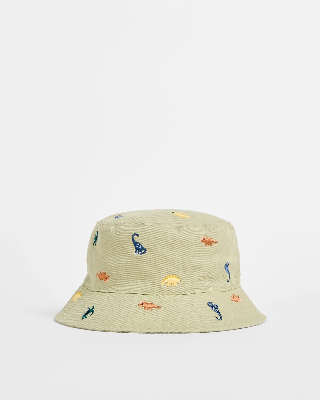 Kids Embroidered Denim Bucket Hat - Khaki Dinosaur