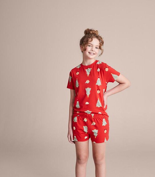 Collect the family set with the red Kids Family Matching Christmas Tree Cotton Pyjama Set. Featuring a t-shirt and matching shorts in an all over red Christmas tree print and crafted from soft cotton for all night comfort.