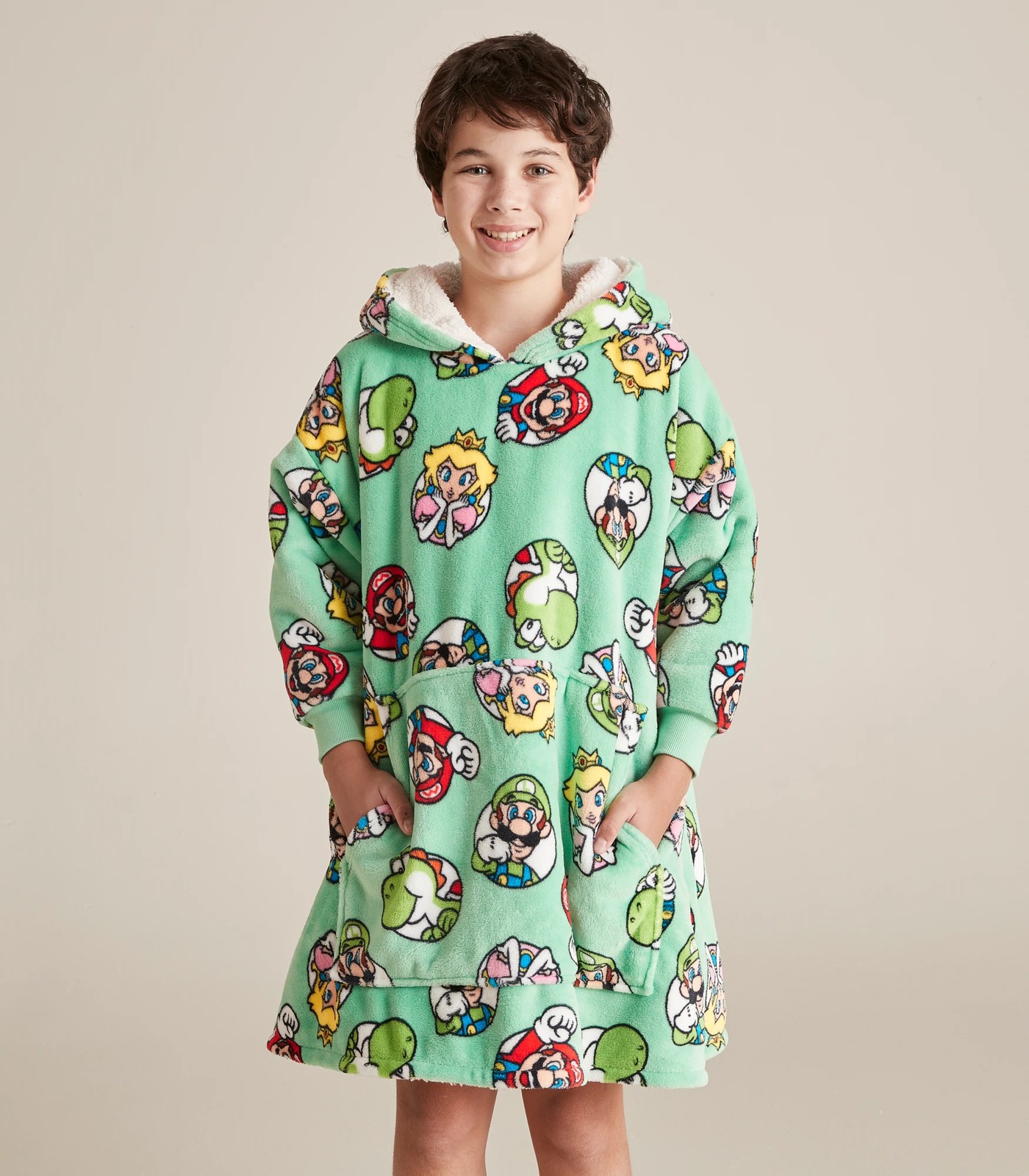 Great to snuggle up in on chilly nights comes the Kids Family Matching Super Mario Fleece Oversized Hoodie, featuring an all over Super Mario print, an extra large front kanga pocket to fit all the essentials for a cosy night in and matches back with the family pyjama sets; available separately.