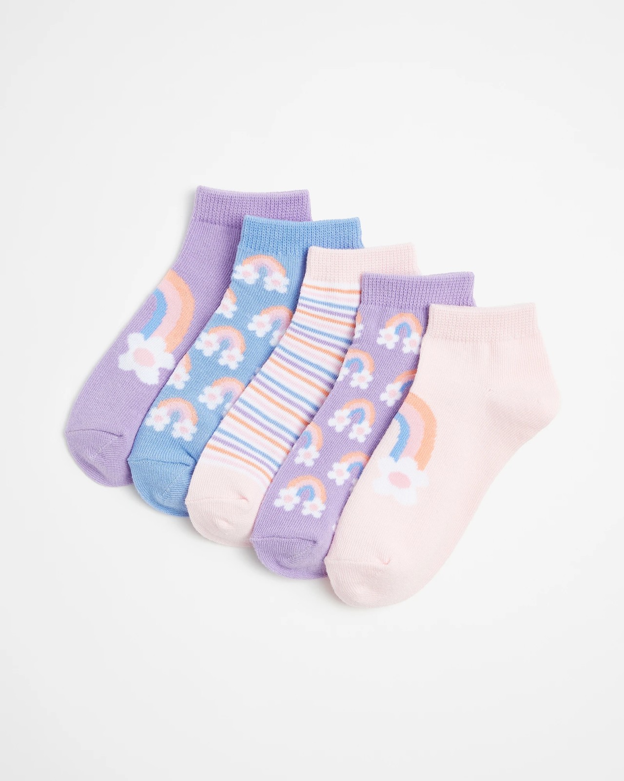 Keep your child's feet snug and stylish with our Kids Low Cut Rainbow Socks - Maxx. Perfect for active little ones, these socks come in a cheerful variety pack featuring delightful rainbow prints. Made from a soft cotton-poly blend, they offer a comfortable fit that will keep pace with your child's day. The low-cut design is perfect for any shoe style, making these socks a versatile addition to their wardrobe. With five pairs in each pack, you'll always have a fresh pair ready to go. Grab yours today and add a splash of colour to your child’s everyday outfits!