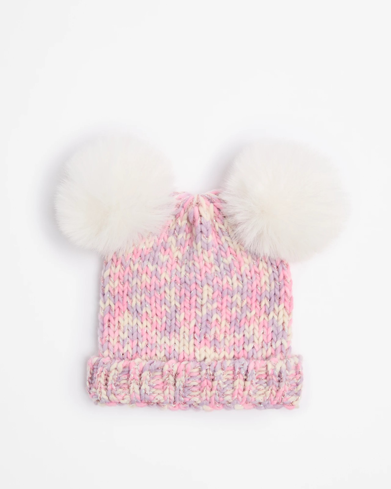 Keep your little ones warm and stylish with this vibrant Kids Metallic Double Pom Pom Beanie. Created from a soft blend of acrylic, polyester, and metallic materials, it features a playful knit pattern in pink, purple, and white. With two large pom poms on top, it adds a fun element to any winter look. The fold-over bottom and straight hemline ensure a snug and comfortable fit. Make this delightful beanie an essential addition to your child's winter wardrobe today.
