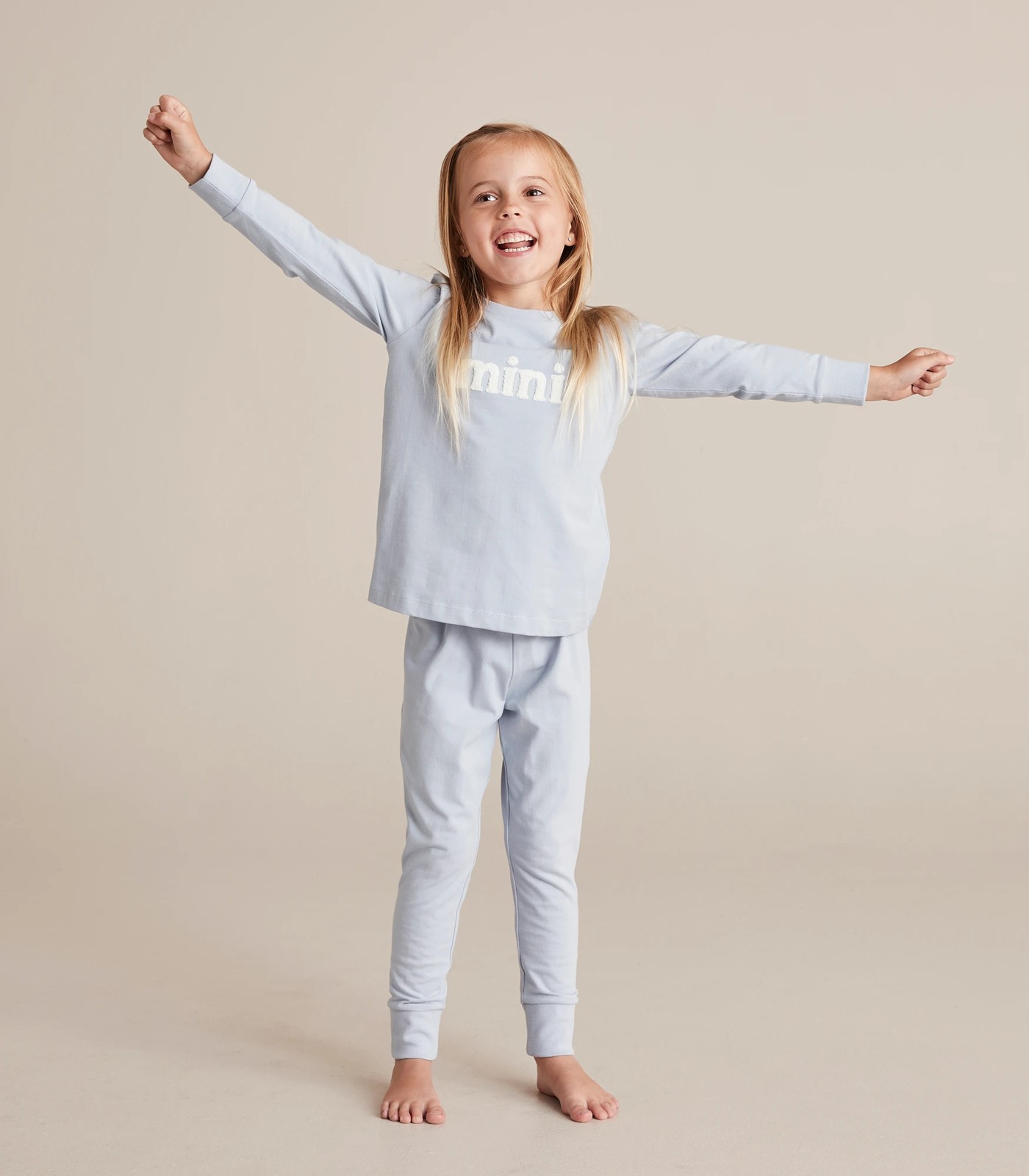 Top: round ribbed neckline, long cuffed sleeves, bold terry wording on chest "MINI"