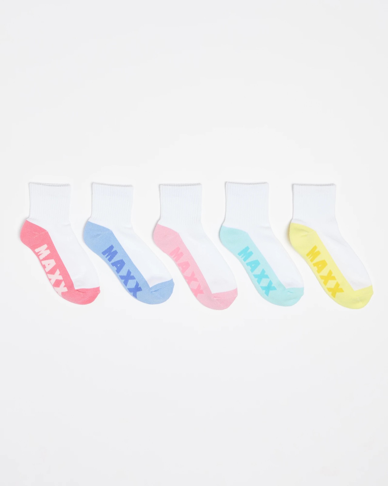 Make sure she is ready for any sport in style with the Kids Qtr Crew Sport Socks - Maxx - 5 Pack! Crafted from a soft and durable cotton poly elastodiene blend, these socks feature a classic quarter crew cut. With five socks in each pack, they come in a variety of colors to match her favorite outfits. Keep her feet comfortable and stylish while playing sports or just running around with the Kids Qtr Crew Sport Socks - Maxx - 5 Pack!