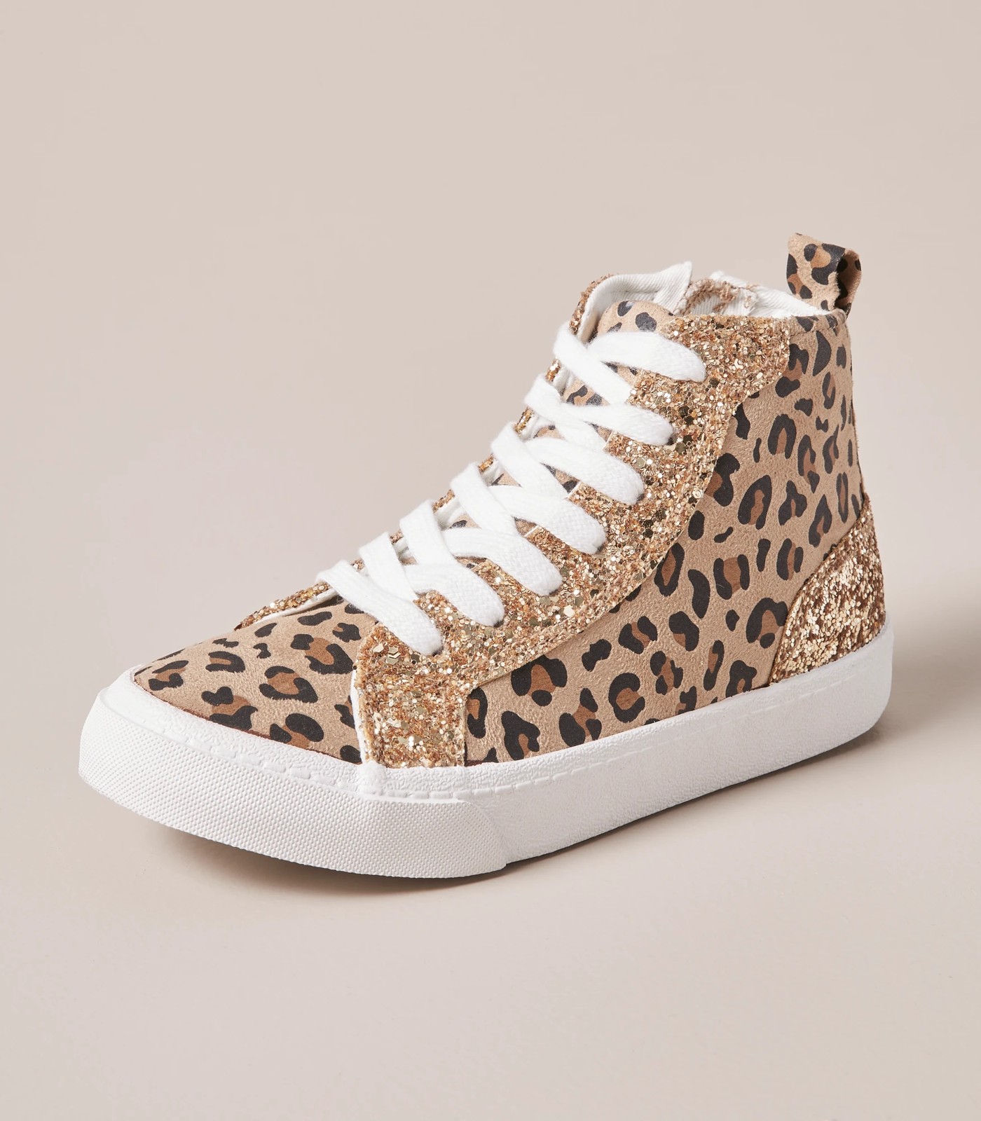 The senior hightop sneakers are sparkly and stylish adn totally on-trend. They feature glitter detailed panels with an all over animal print, lace-up front with inner side zips for easy pull on and a non-slip sole.