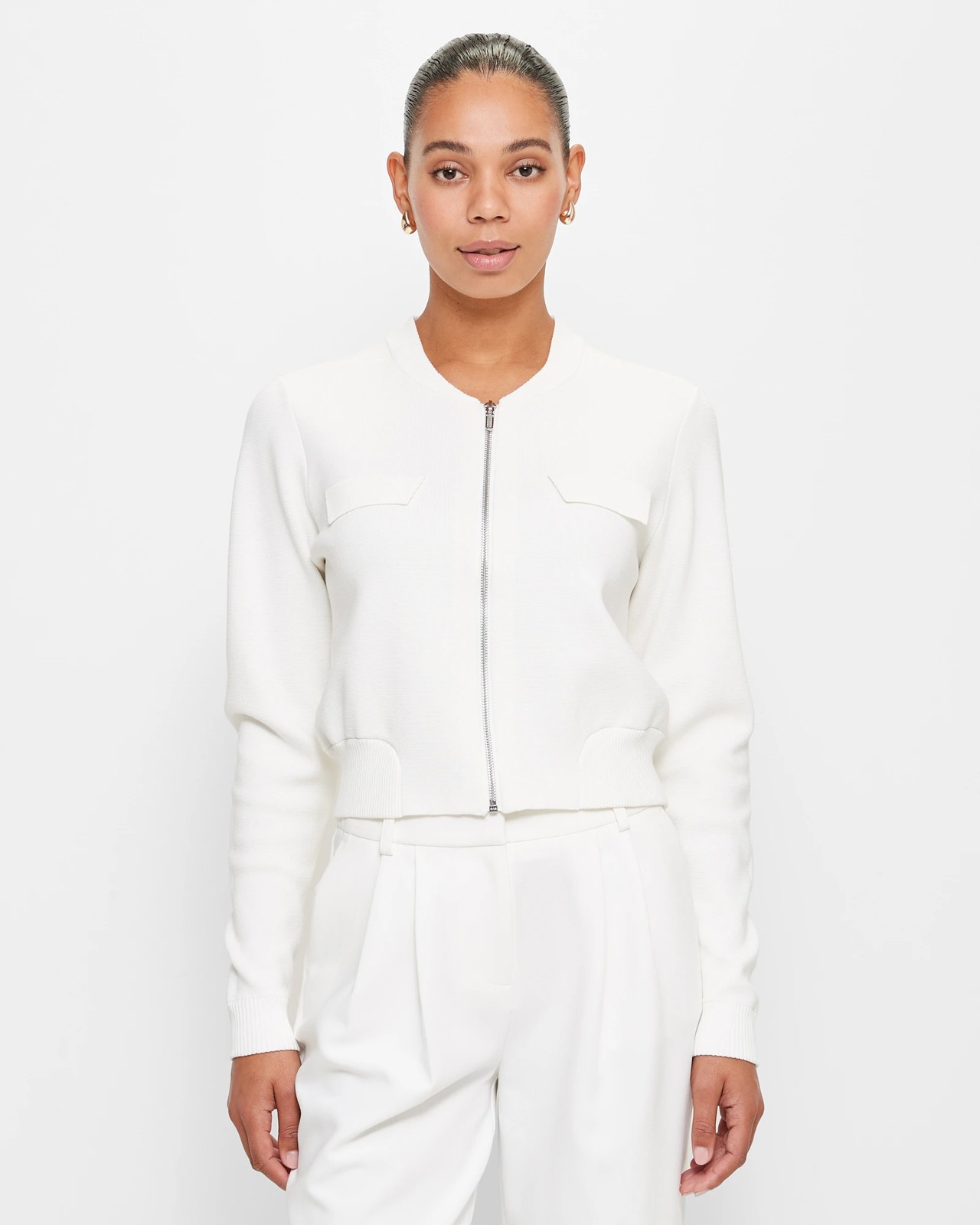 Embrace comfort and style with our cosy knitted bomber jacket. Crafted from a luxurious blend of viscose and nylon, our jacket features an eye-catching all-over knit design, offering warmth and texture. The classic bomber style is complemented by a round ribbed neckline and long ribbed cuff sleeves, creating a timeless look. Upgrade your essentials with our knit bomber jacket and experience the ultimate blend of comfort and fashion.