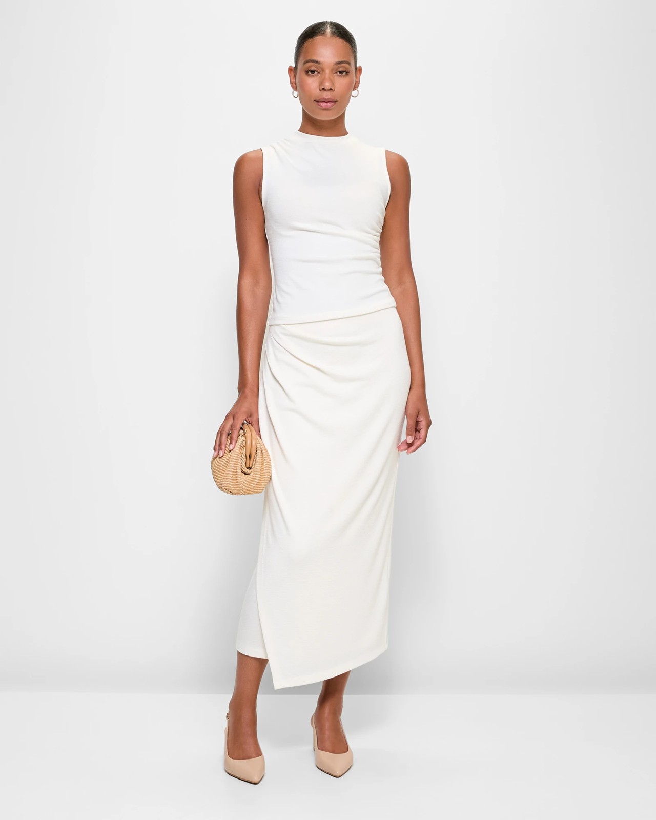 Discover the charm of our Knit Drape Midi Skirt. Designed for versatility, this piece features a smooth viscose and polyester blend with added elastane for comfort. The wrap-around front and side draping add a delightful flow, complemented by a flat inner elastic waistband for a comfortable fit. With a midi length and straight hemline, this skirt is perfect for both casual and dressy settings. Add this timeless piece to your collection and enjoy style and comfort.