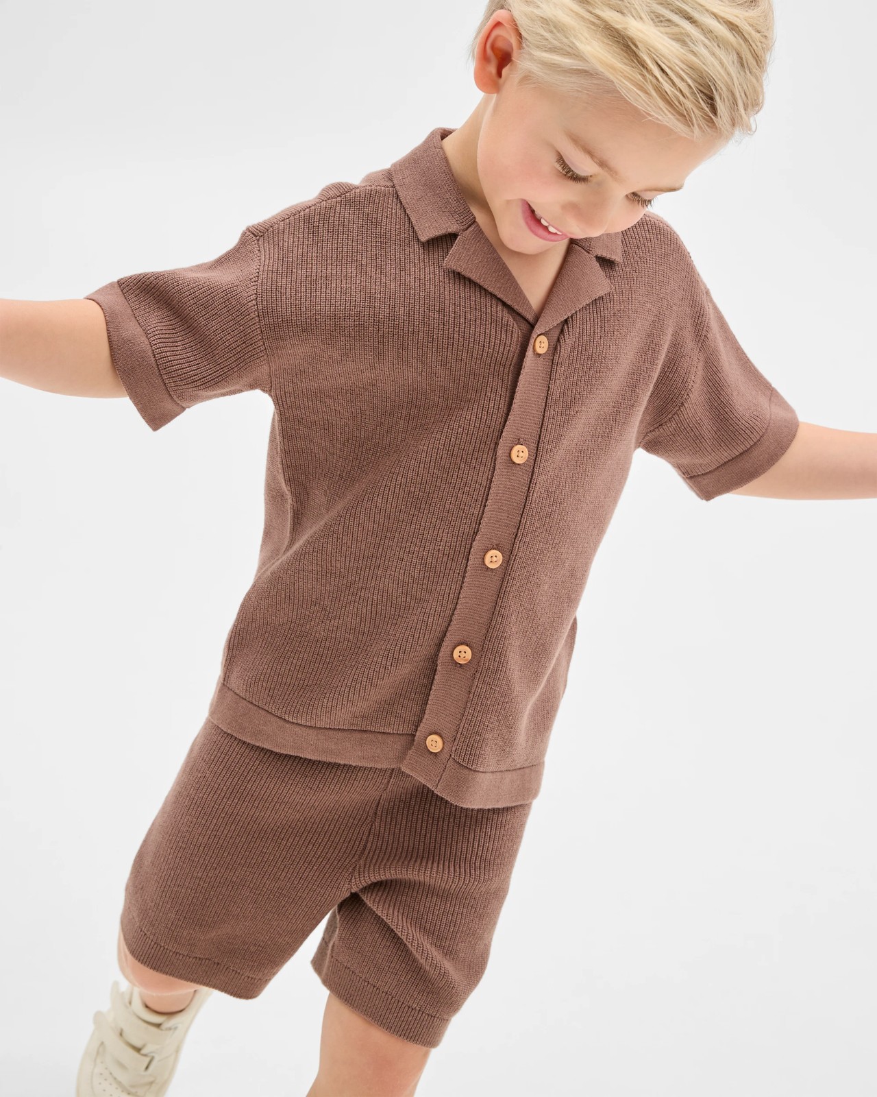 Discover comfort and style combined with our Knit Shirt and Short 2 Piece Set. This outfit features a collared knit shirt with a button-down front and short sleeves, ensuring easy movement. The matching shorts, designed with an elastic waistband and drawcord, provide a perfect fit for endless play. This versatile set will effortlessly become a wardrobe favourite. Don't miss out on giving your little one the perfect mix of fashion and functionality.