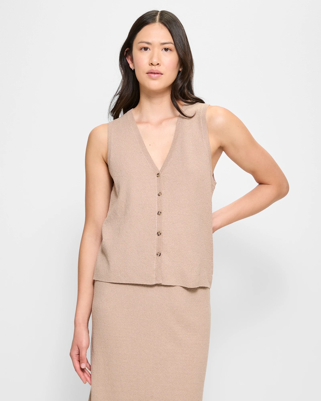Discover the perfect addition to your wardrobe with our Knit Vest, designed for women who appreciate both comfort and style. Made from a blend of acrylic, nylon, and polyester, this vest features a beautifully textured knit pattern. Its regular fit and classic colourway with a v-neckline offer easy pairing with various outfits. The button-down front and sleeveless design make it a versatile piece for layering. Don't miss out – add this elegant piece to your collection today!