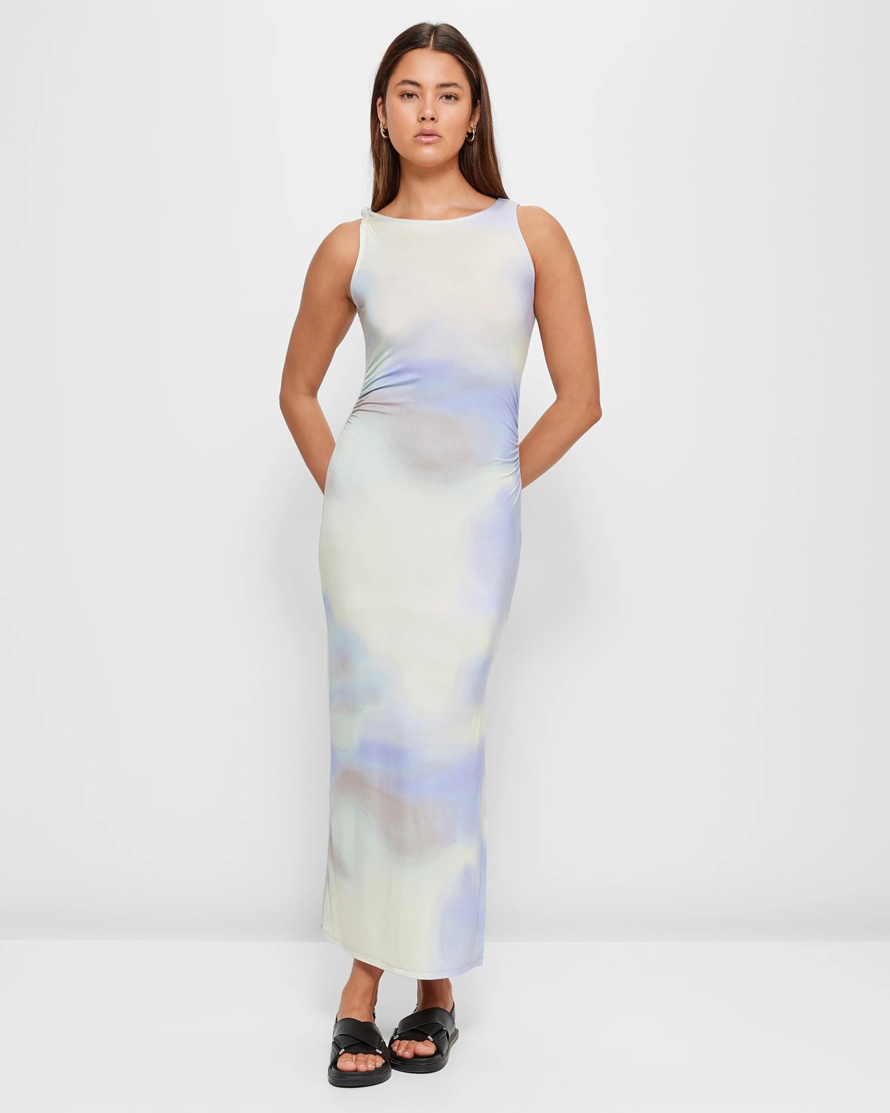Introducing the Knot Shoulder Midi Dress by Lily Loves, the ultimate fashion statement for any occasion. Made from a luxurious viscose rich fabrication, this dress offers the perfect blend of style and comfort. With its soft-to-the-touch fabric and stretchy fit, it'll feel like a dream against your skin. The slim fit silhouette flatters your figure, while the watercolour print adds a touch of elegance. Featuring a crew neckline and sleeveless design with thick shoulder straps, this dress also boasts a unique knot detail on one shoulder, adding an extra element of chic. The side ruching and midi length create a flattering shape, and the long side seam split adds an alluring touch. Complete your look with confidence as you step out in this stunning dress. Get yours now and make a fashion statement that will turn heads wherever you go!