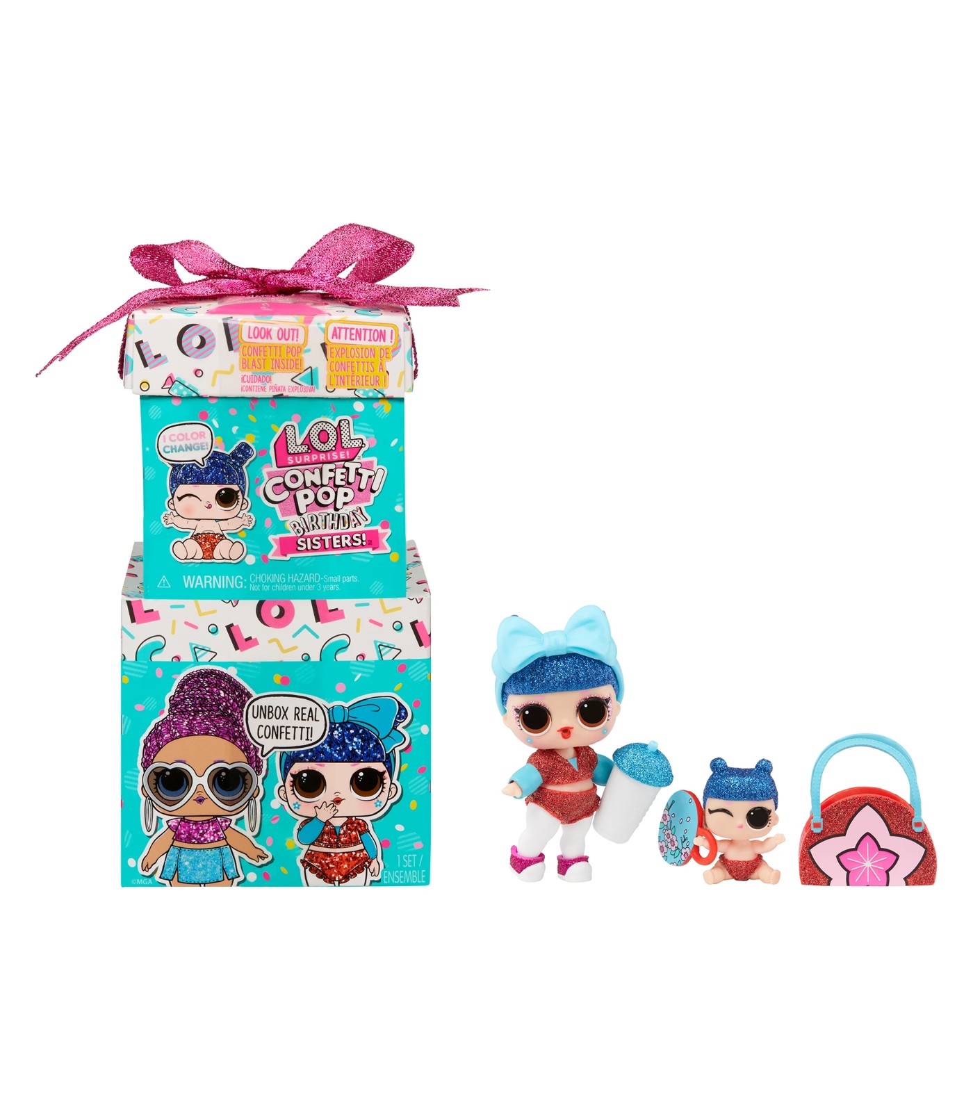 • 10 SURPRISES: (1) L.O.L. Surprise! Confetti Pop Birthday™ doll; (2) Outfit; (3) Shoes; (4) Bottle; (5) Accessory; (6) Lil Sister; (7) Shoes; (8) Accessory; (9) Confetti Surprise Unboxing; (10) Lil Sister Colour Change Surprise
