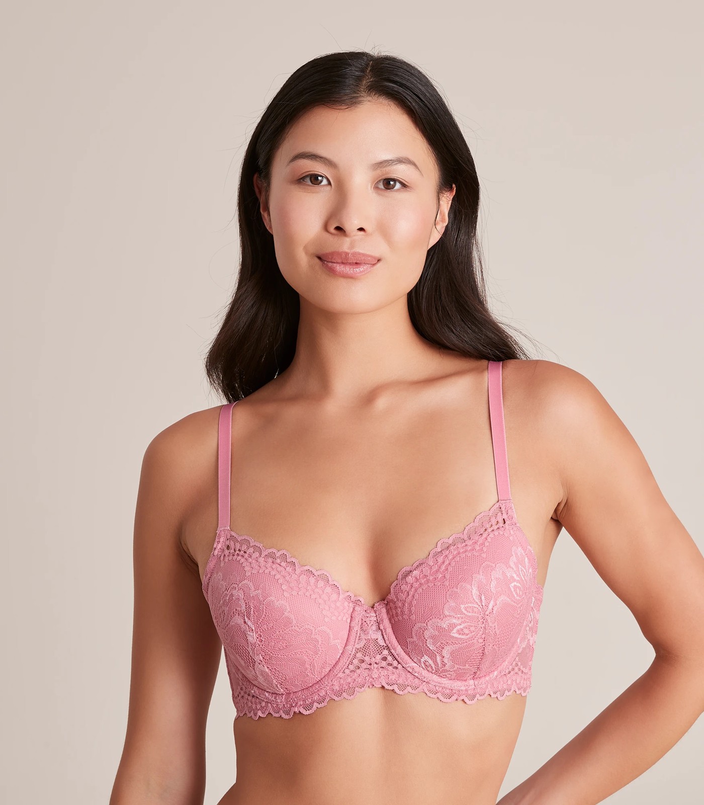 The lace balconette bra will leave you feeling comfortable throughout the day and is a great everyday bra. It features a full coverage front, gives a natural lift, has thin adjustable shoulder straps and underwire for support.