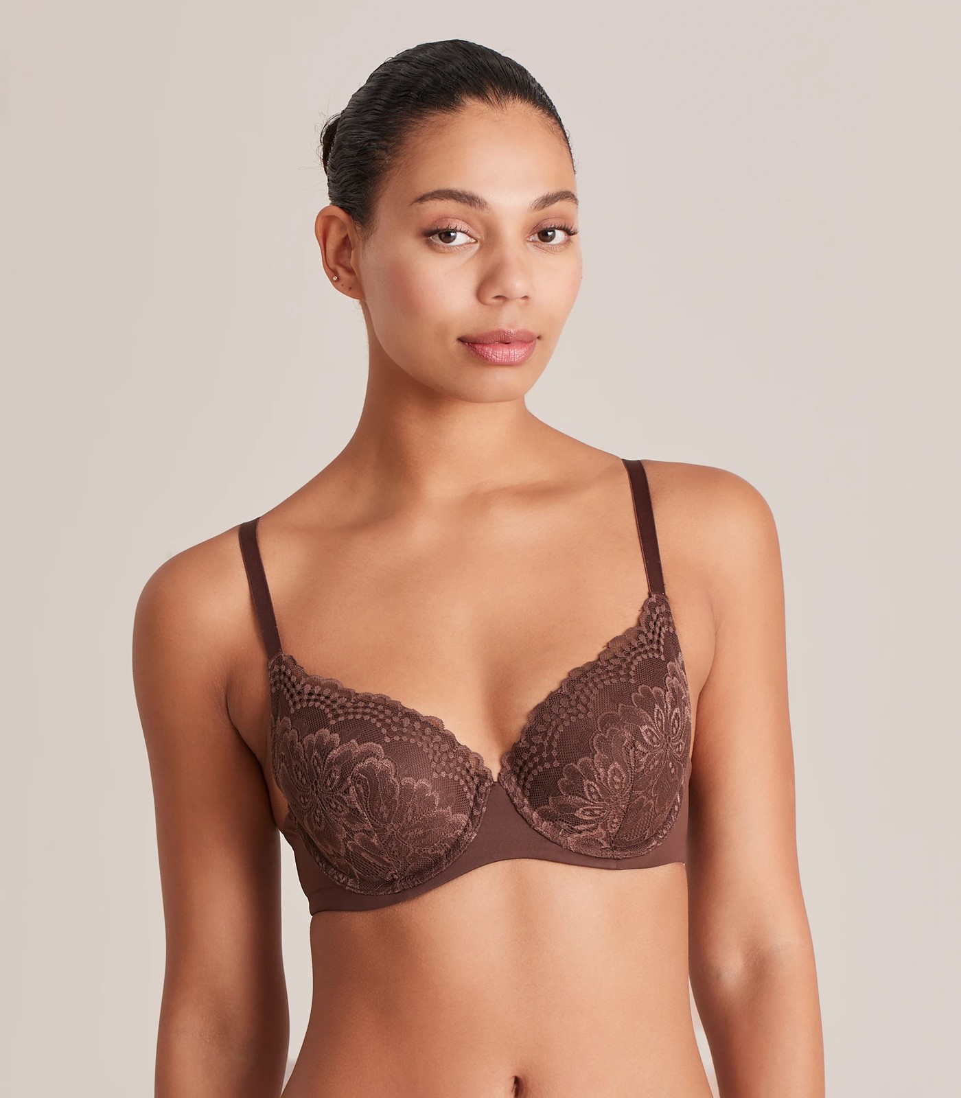 The lace t-shirt bra will leave you feeling comfortable throughout the day and is the perfect bra to wear under tight fitting clothes. It features a full coverage cup with light padding, a lace covered front and a soft silky material on the back and sides.