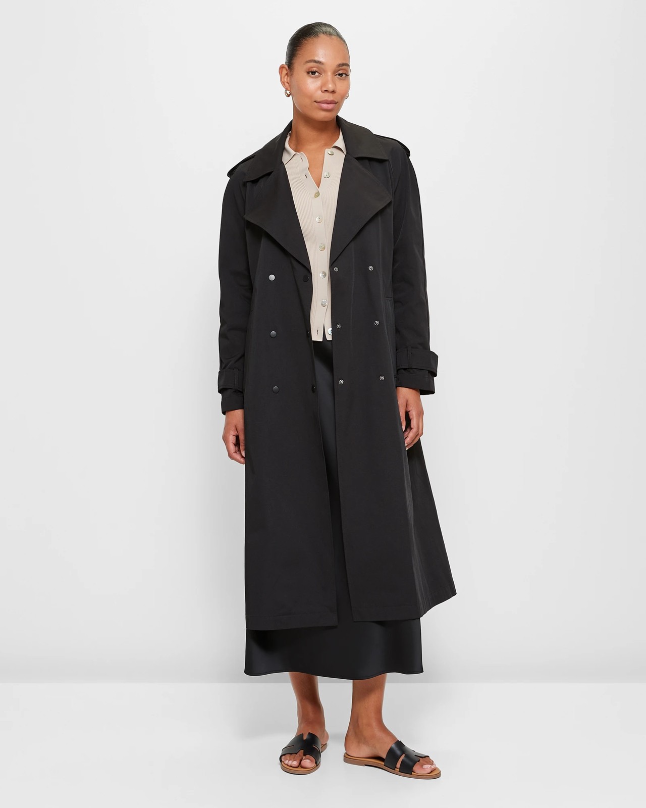 Stay warm and stylish this season with our Layering Trench Coat. Made from a comfortable cotton/polyester blend, this coat offers stretch for added comfort and is fully lined for a luxurious feel. The classic trench cut with a round collared neckline and lapels gives it a timeless appeal. Hidden press stud shoulder tabs and adjustable press stud straps at the wrists add an extra touch of functionality. The double-breasted press stud front closure and removable tie waist belt create a flattering silhouette. With front pockets and a straight hemline, this long-length coat also features a back bottom centre split for easy movement. Perfect for layering, this trench coat is a must-have addition to your winter wardrobe.