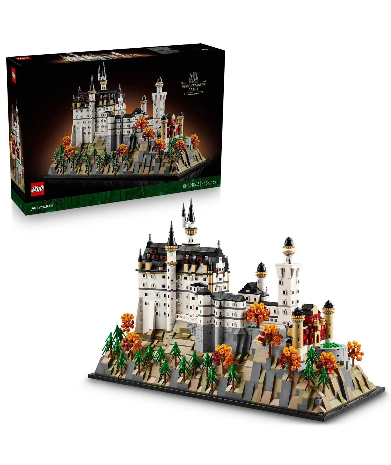 Dive into your passion for iconic landmarks with this collectible 3,455-piece LEGO® Architecture Neuschwanstein Castle (21063) building set for adults. Spend quality time building a display piece that also makes a great architectural gift for you or other history lovers. The build is full of surprises, from the exterior spires, turrets, courtyard, staircases and gabled roofs to the small interior builds. Plus, the foliage of the surrounding trees can be changed to depict a summer or autumn landscape. Serenity awaits as you build this detailed LEGO castle set.