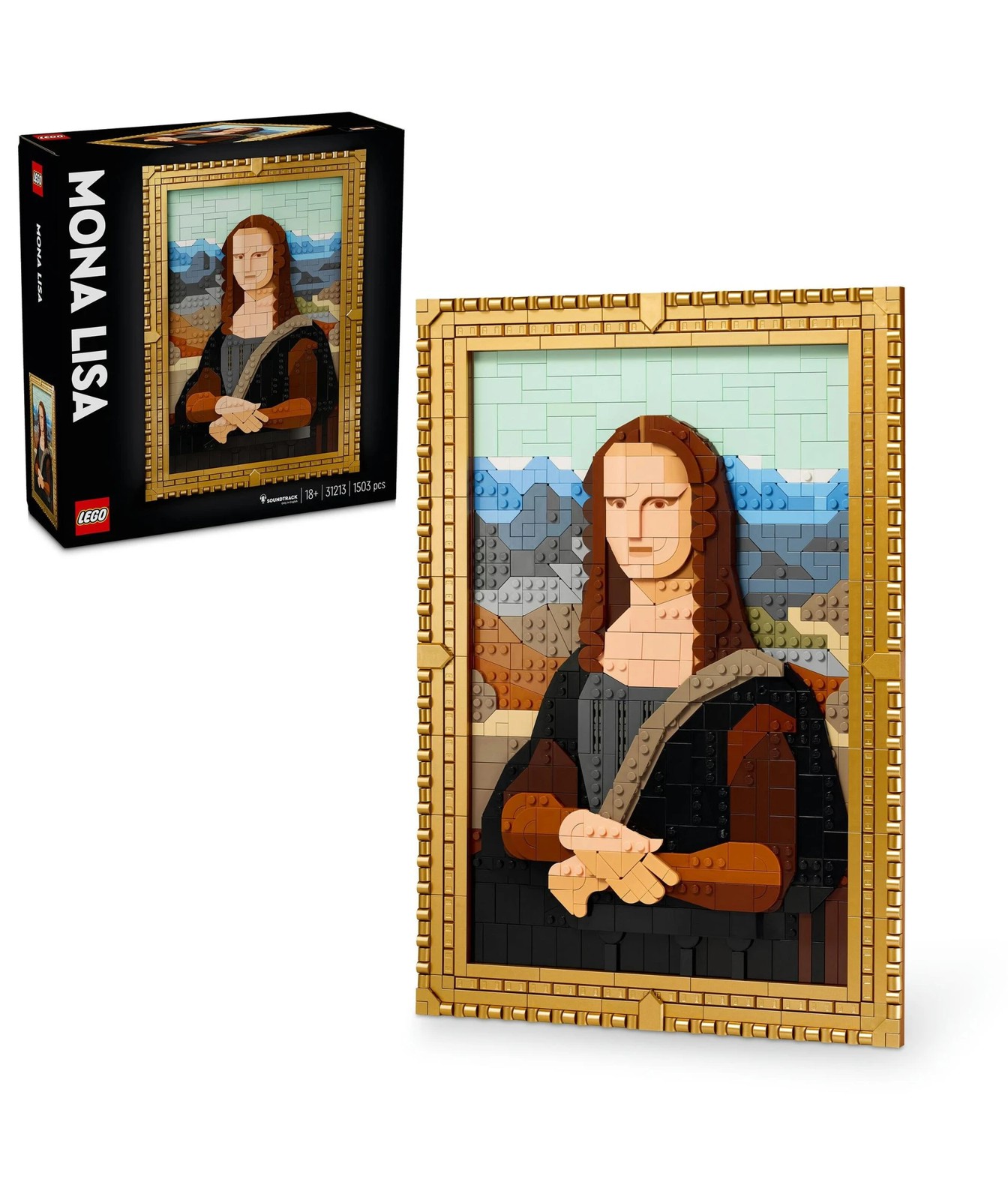 Positioned in its elegant gold frame, this Mona Lisa painting is designed to be hung on a wall. The frame is detachable and can be used to display other LEGO Art pieces from an existing collection. This LEGO set for adults also comes with a building instructions booklet and, after scanning a QR code, you can listen to the Soundtrack featuring fascinating content on the Mona Lisa’s timeless appeal.