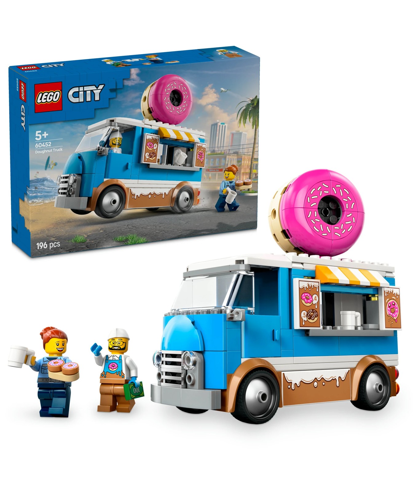 Introducing the ultimate vehicle toy for sweet-treat fans aged 5 and over. The LEGO® City Doughnut Truck playset (60452) comes with a delicious icing decoration, giant roof doughnut and an accessible prep area with a coffee machine and cash register. Kids can serve up tasty doughnuts and drinks from the service window and detach the kiosk for added play options. Just add the seller and customer minifigures and let the fun begin.