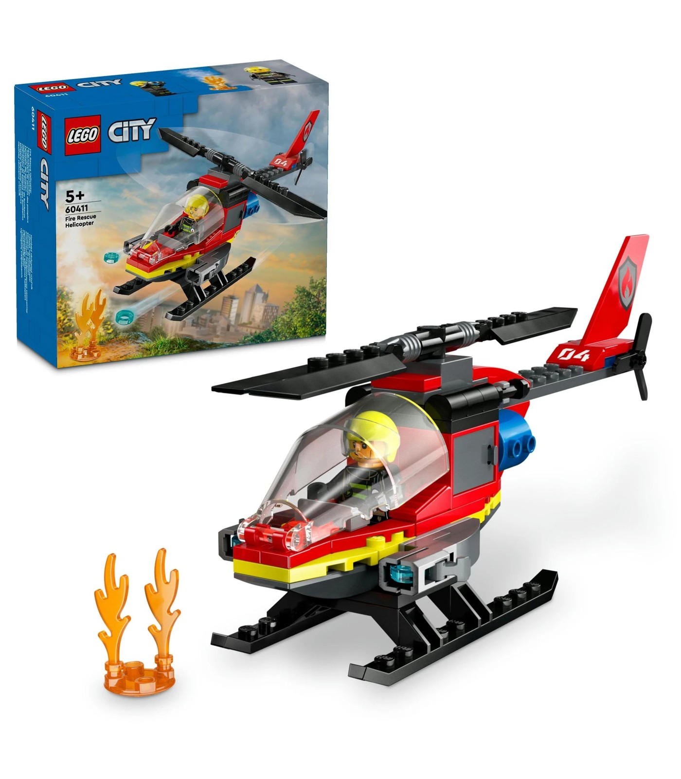 Ignite your child's imagination with the LEGO City Fire Rescue Helicopter toy (60411). This exciting playset includes a toy fire rescue helicopter featuring spinnable rotors and 2 LEGO water element launchers, as well as a firefighter pilot minifigure.