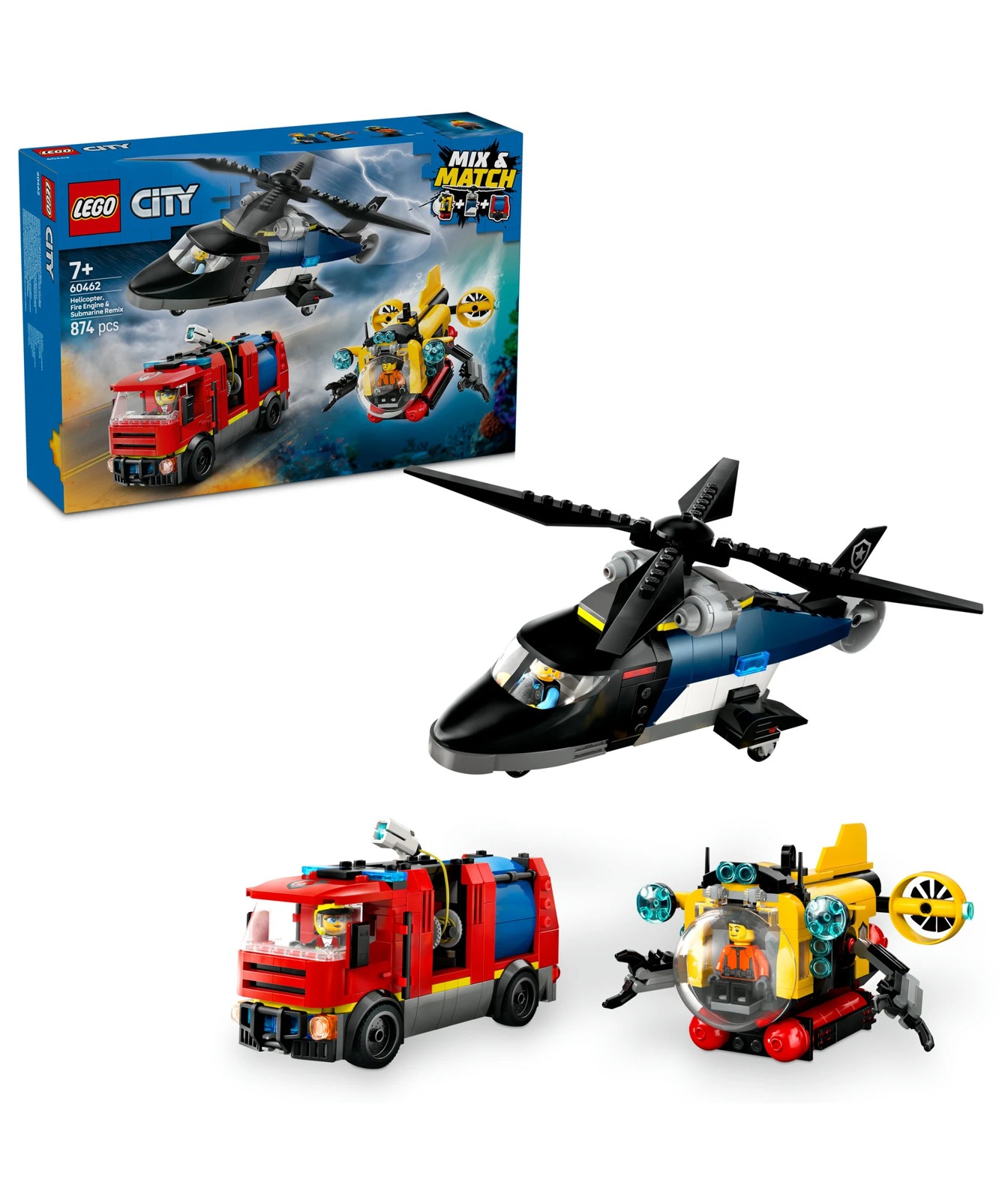Kids who love to build and create will love the LEGO® City Helicopter, Fire Engine & Submarine Remix toy playset (60462) for ages 7 and over. This 3-model building set includes a police helicopter with spinning main and tail rotors, an exploration submarine with a bubble cockpit and posable claw arms, and an iconic fire engine with an extendable hose. Each model comprises 3 modular parts that can be combined, allowing kids to mix and match an array of action vehicles ready for exciting missions. Just add the police officer, helmsperson and firefighter minifigures and let the fun begin!