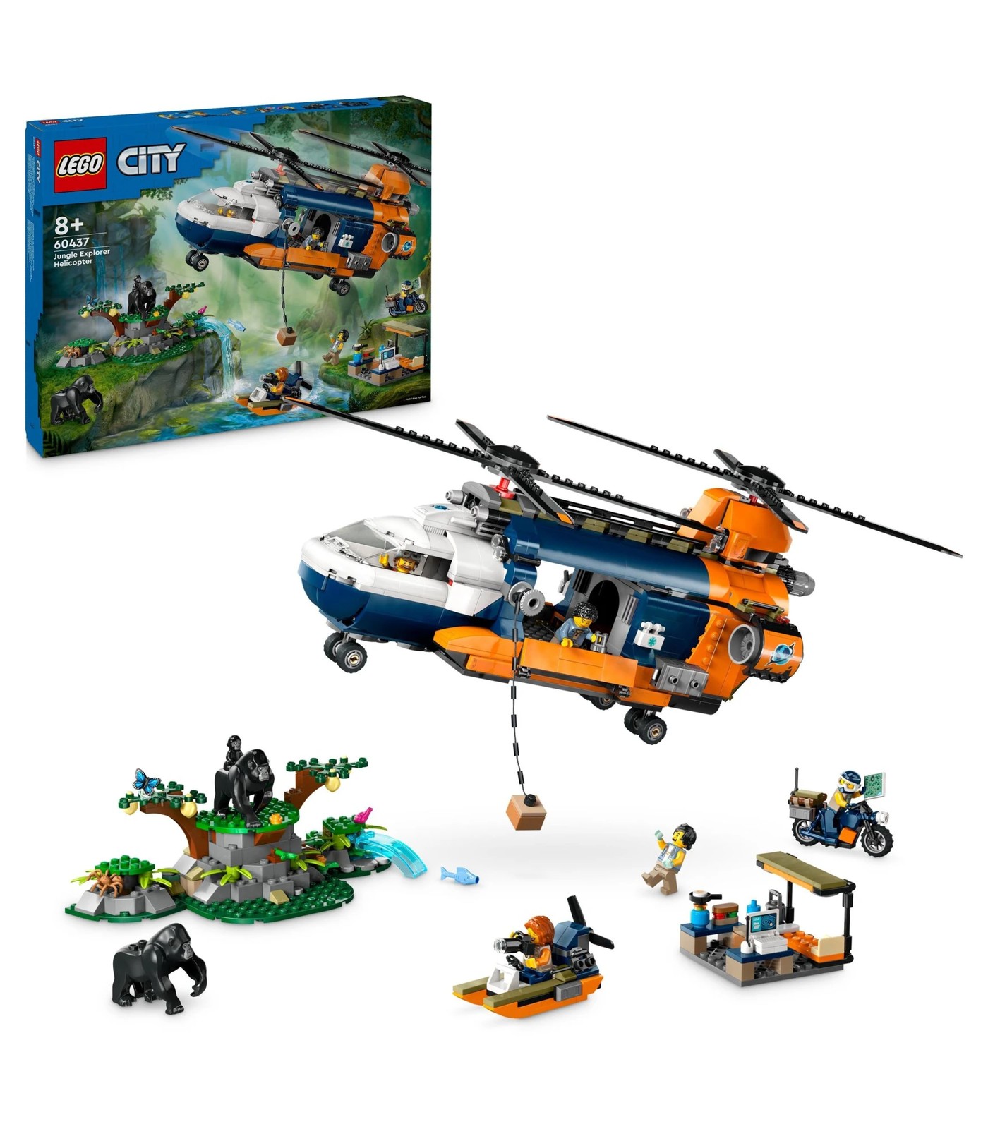 Treat your little explorer to the LEGO® City Jungle Explorer Helicopter at Base Camp (60437) adventure playset for ages 8 and over, featuring a realistic helicopter toy with synchronised twin rotors, 2 cargo bays and a working winch. The set also includes a motorcycle, swamp boat and jungle base camp, plus 5 adventurer minifigures and 3 gorilla toy figures, including a baby gorilla, for imaginative play and storytelling.